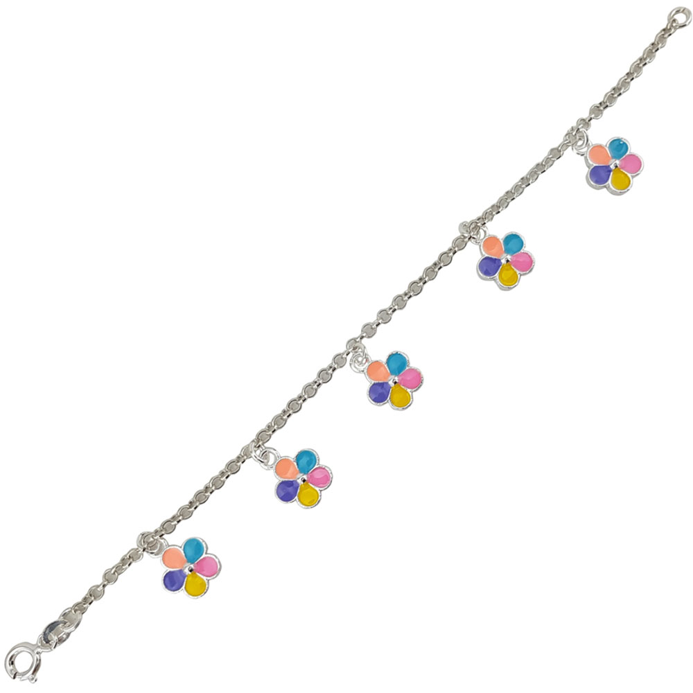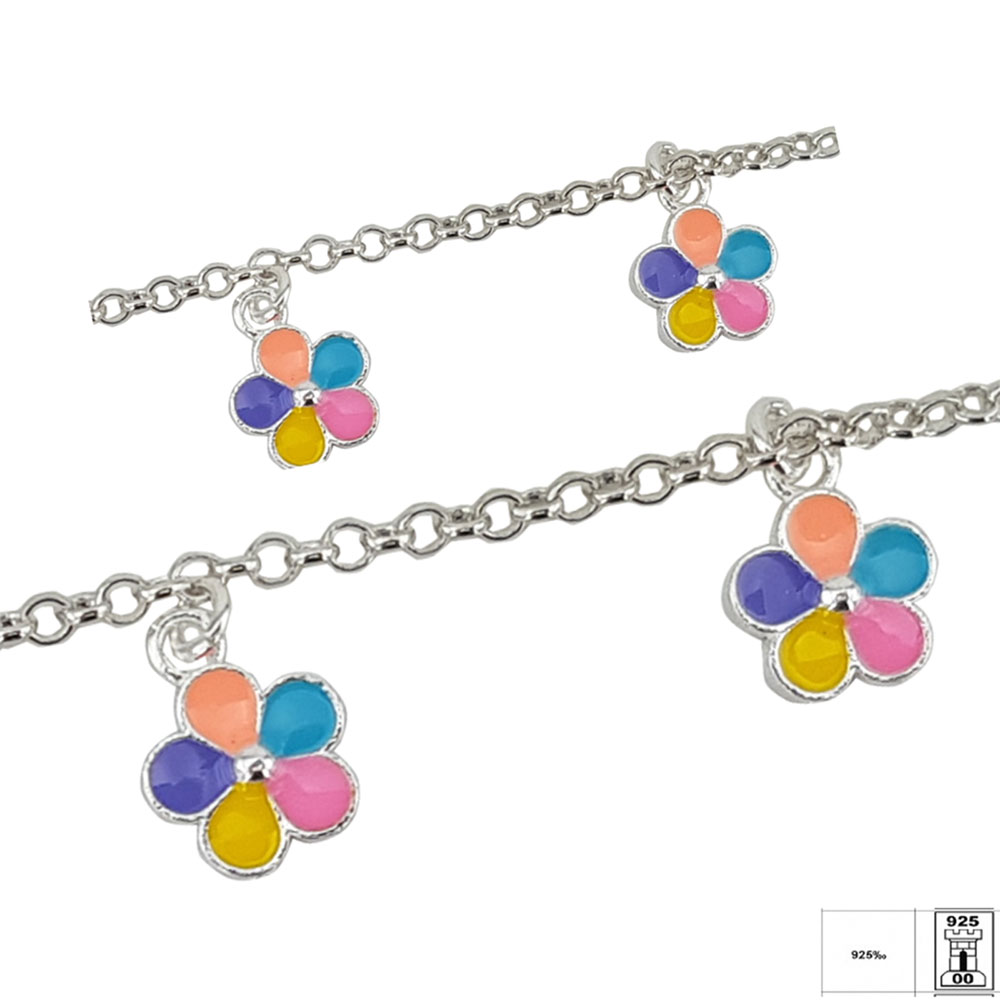 Designul delicat include floricele emailate in nuante de roz, albastru, galben si portocaliu, distribuite uniform pe un lant fin si rezistent, cu o lungime de 15 cm. Fiecare floare are un diametru bine proportionat, oferind un efect vizual placut si jucaus. Cu un gramaj de 4.36 grame si o latime de 12.5 mm, bratara se potriveste perfect pe incheietura unui copil, oferind confort si libertate de miscare.