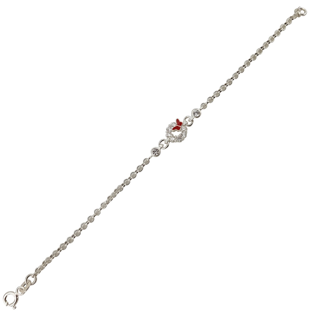 Piesa centrala este formata dintr-un cerc decorat cu zirconii stralucitoare, care reflecta lumina intr-un mod spectaculos, accentuat de un fluturas rosu realizat din email. Acest detaliu adauga un farmec aparte si o nota de veselie, perfecta pentru personalitatea vibranta a copiilor.
