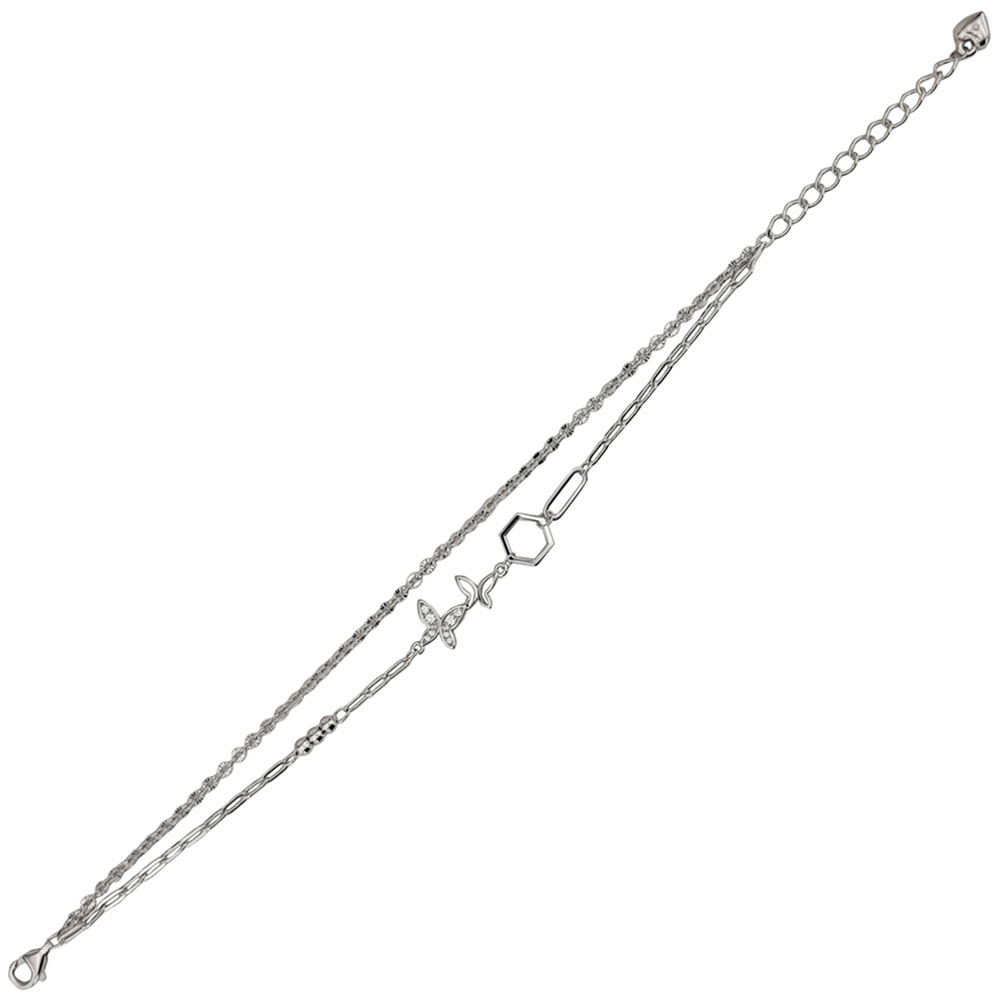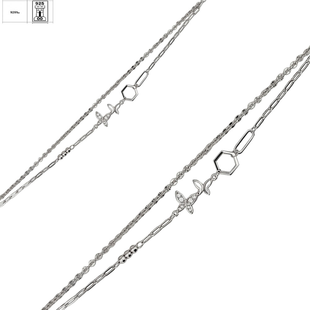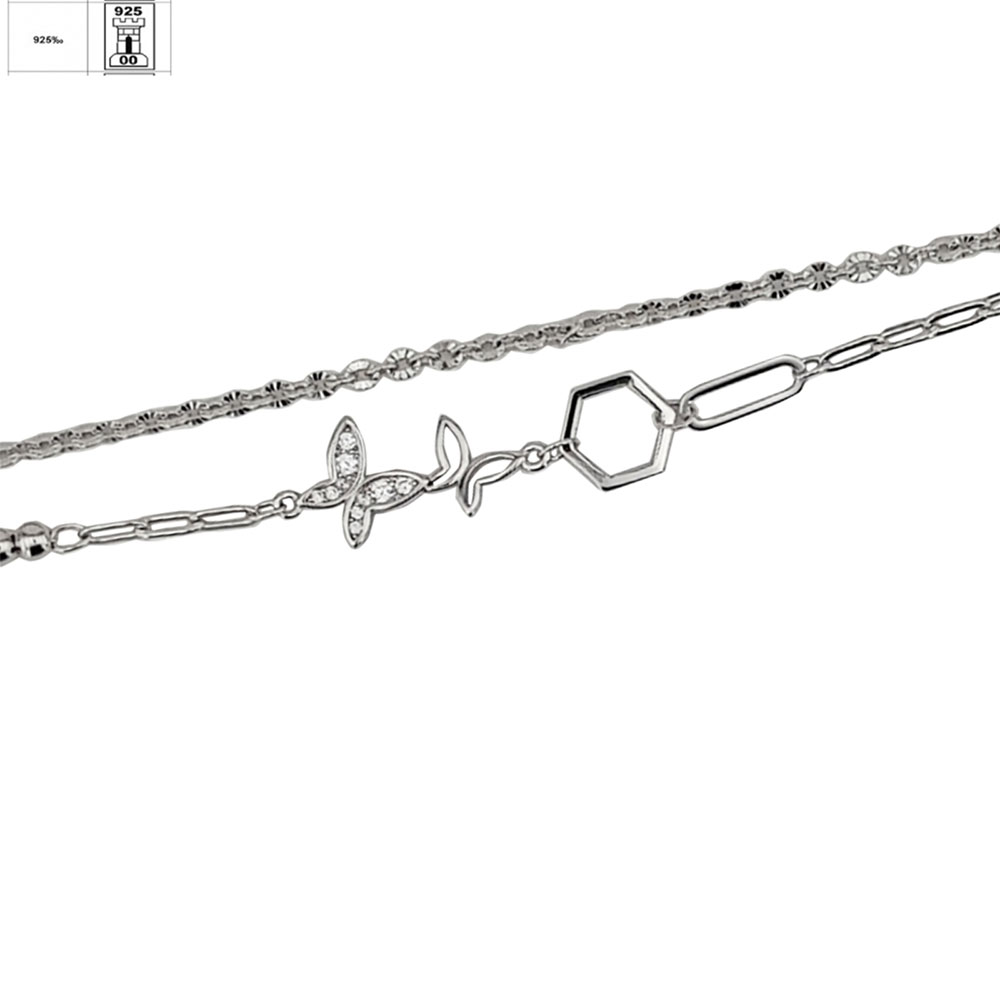 Unul dintre lanturi este decorat cu pandantive delicate in forma de fluturi, incrustati cu zirconii stralucitoare, bilute fine din argint si un contur geometric in forma de hexagon, adaugand un accent contemporan. Cu o lungime de 17 cm si posibilitate de ajustare, bratara se potriveste perfect pe incheietura, oferind confort si stil in orice context.
