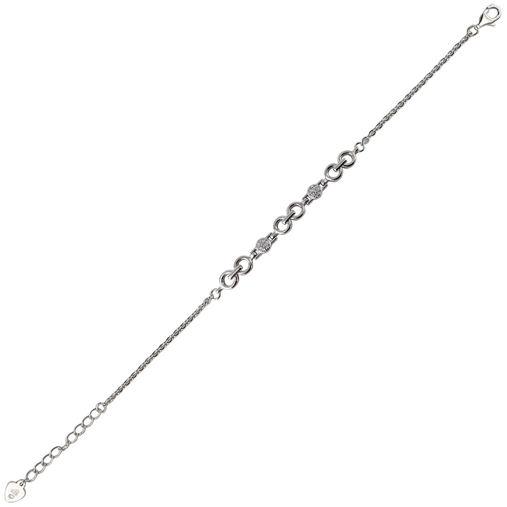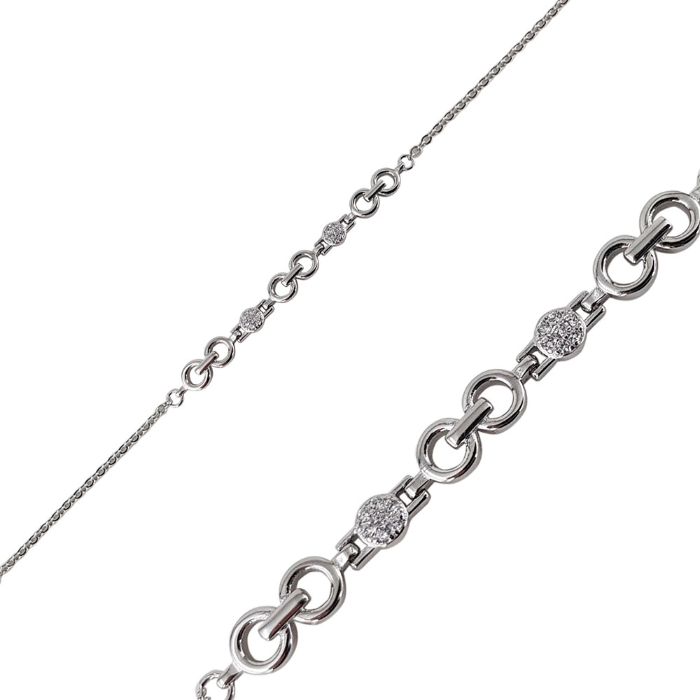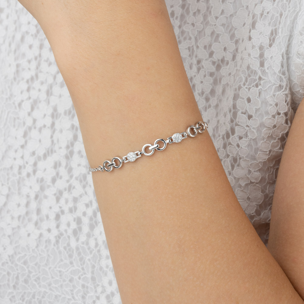 Bratara Thia este decorata cu simbolul infinitului, interspersat cu cercuri elegante incrustate cu zirconii albe. Fiecare piatra este meticulos asezata pentru a reflecta lumina si a adauga o nota de glamour oricarei tinute. Lungimea bratarii este ajustabila intre 15-19 cm, asigurand o potrivire perfecta pentru orice marime a incheieturii.