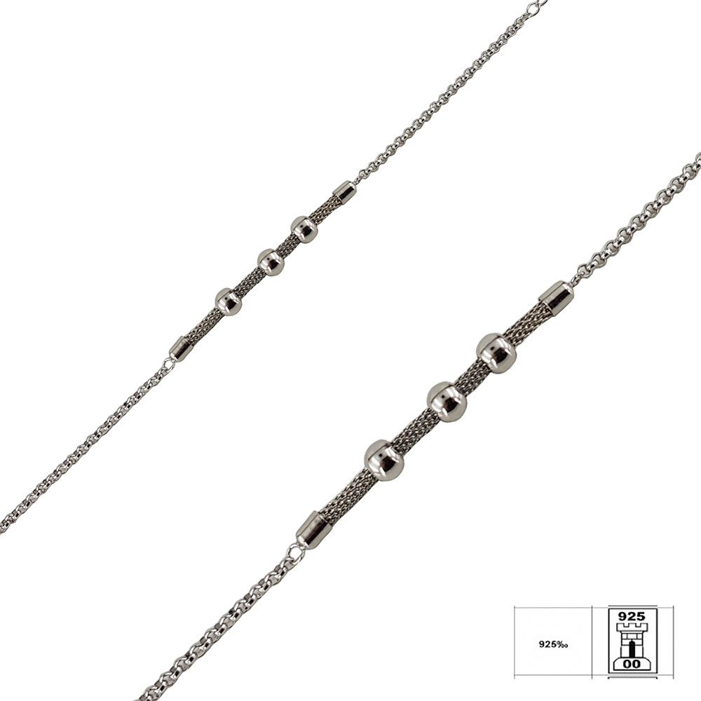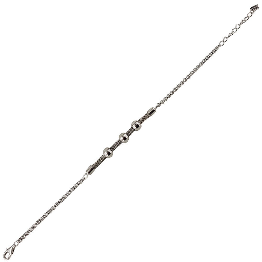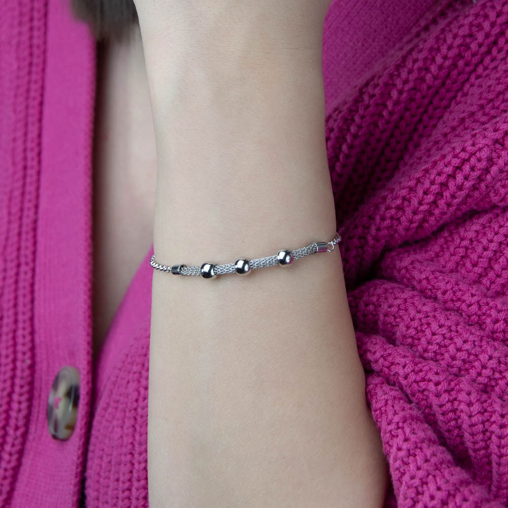 - Design unic: bratara prezinta un sirag de bilute mobile plasate pe o banda mesh, ce adauga un efect vizual distinctiv si modern.