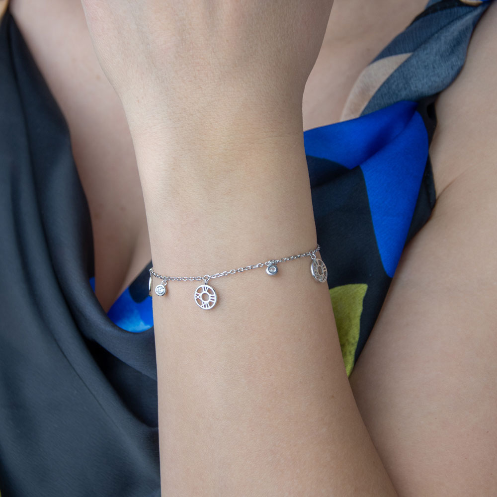 Design-ul inovativ include trei pandantive cu detalii de ceasuri cu cifre romane, interschimbate cu doua zirconii stralucitoare, montate in stil solitaire, ce aduc o nota de rafinament. Fiecare element este meticulos lucrat, reflectand o atentie deosebita pentru detalii si calitate.