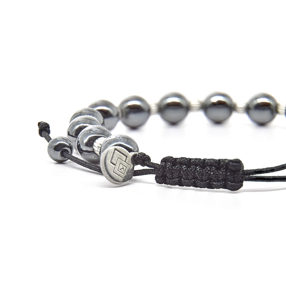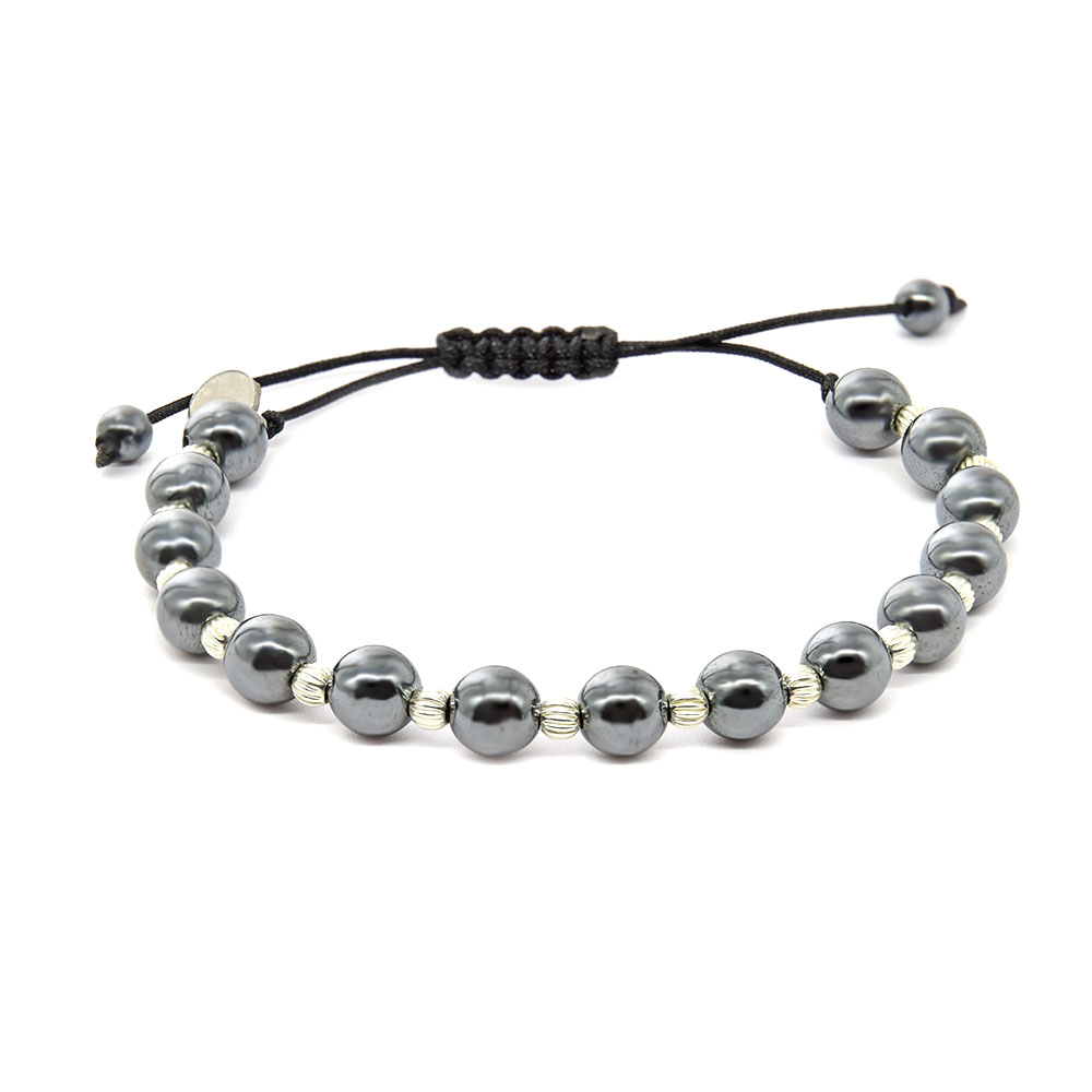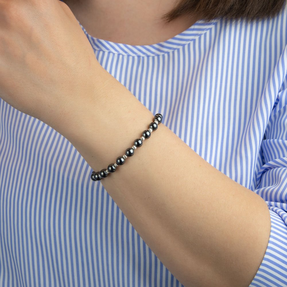 Design-ul reglabil al bratarii permite ajustarea confortabila de la 15 cm pana la 22 cm, asigurand o potrivire perfecta pentru orice marime a incheieturii. Intregul accesoriu este finisat cu bilute lucioase din argint care alterneaza cu hematitele, conferind o stralucire discreta si un stil sofisticat.