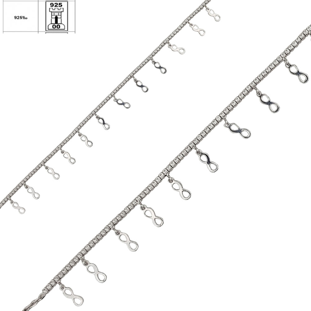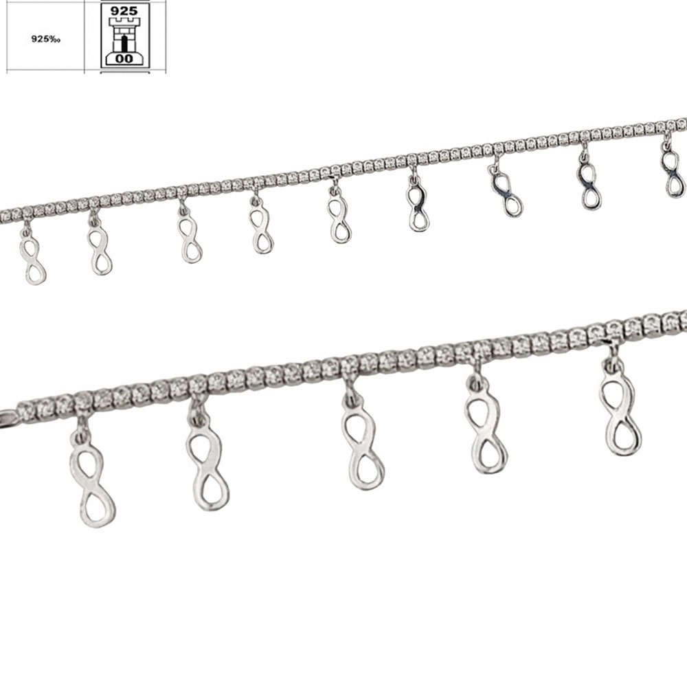 Realizata din argint 925 de calitate superioara, aceasta bratara se remarca prin designul tennis clasic, completat de zirconii albe ce ofera un plus de stralucire si rafinament. Elementele decorative sub forma de simbol infinit sunt distribuite armonios, oferind bijuteriei un aer sofisticat si modern.