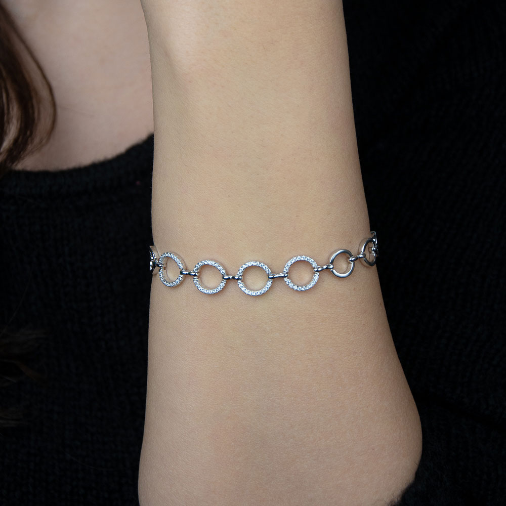 Redescopera eleganta clasica cu Bratara din Argint 925 Thia, o bijuterie ce combina frumusetea intemporala a argintului cu un design modern de zale rotunde, fiecare incrustata cu zirconii albe stralucitoare. Aceasta bratara este nu doar un accesoriu, ci o declaratie de stil si rafinament, perfecta pentru orice ocazie.