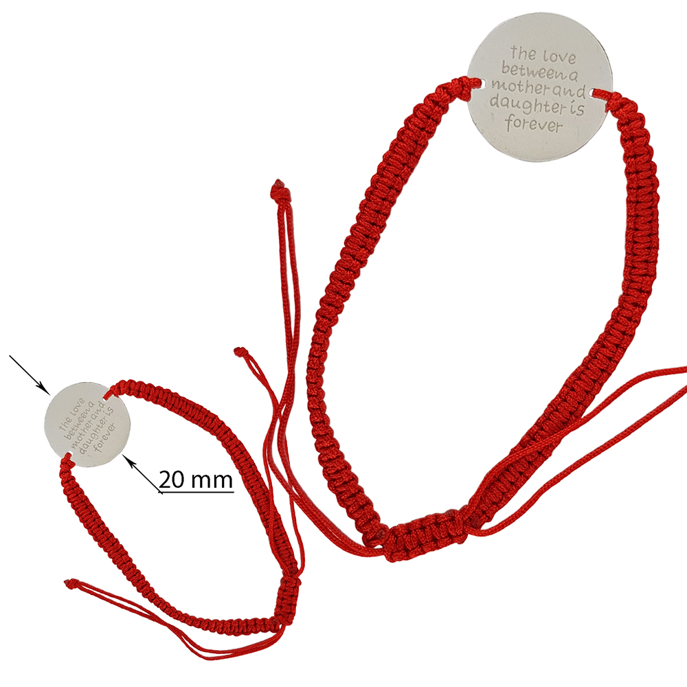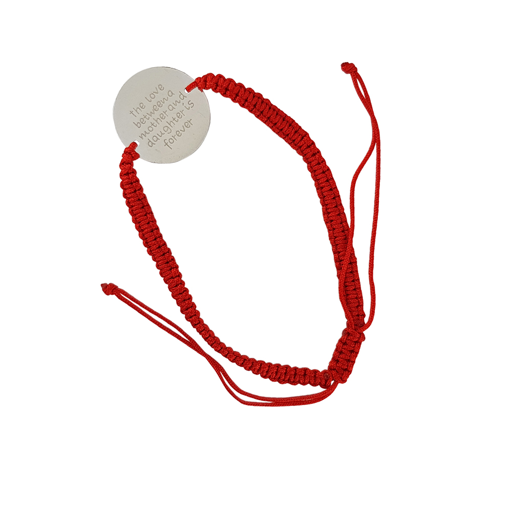 Bratara snur rosu, marime reglabila 16-24 cm, cu banut gravat cu mesaj the love between a mother and daughter is forever".