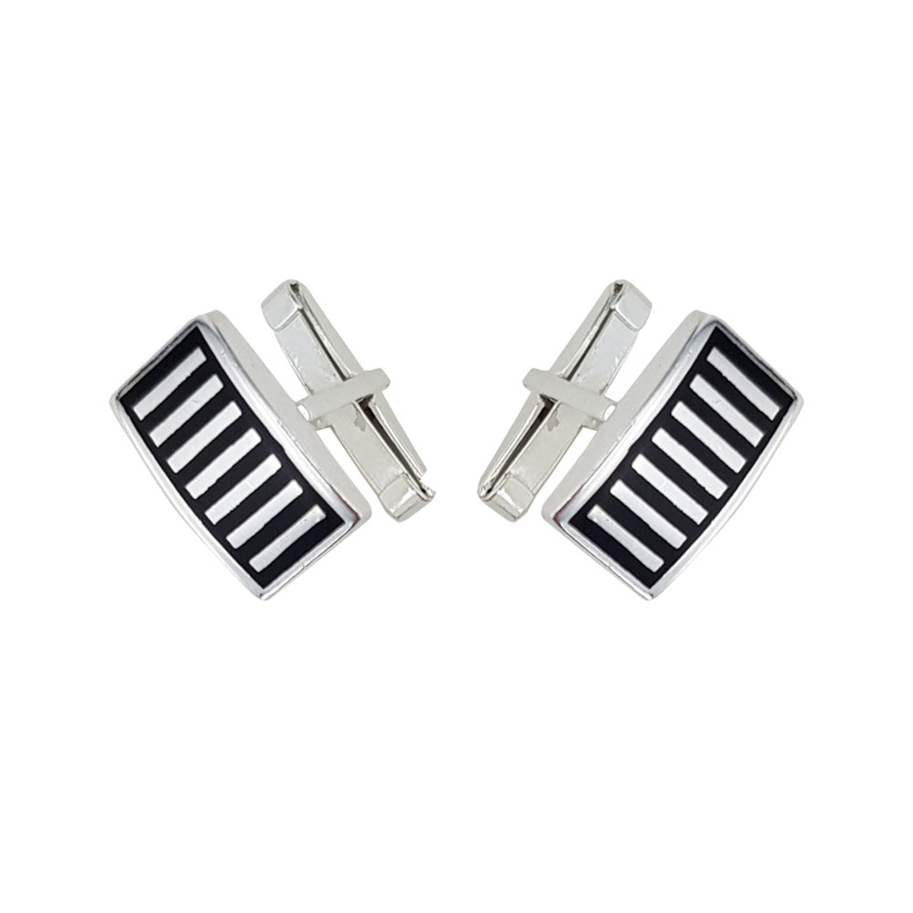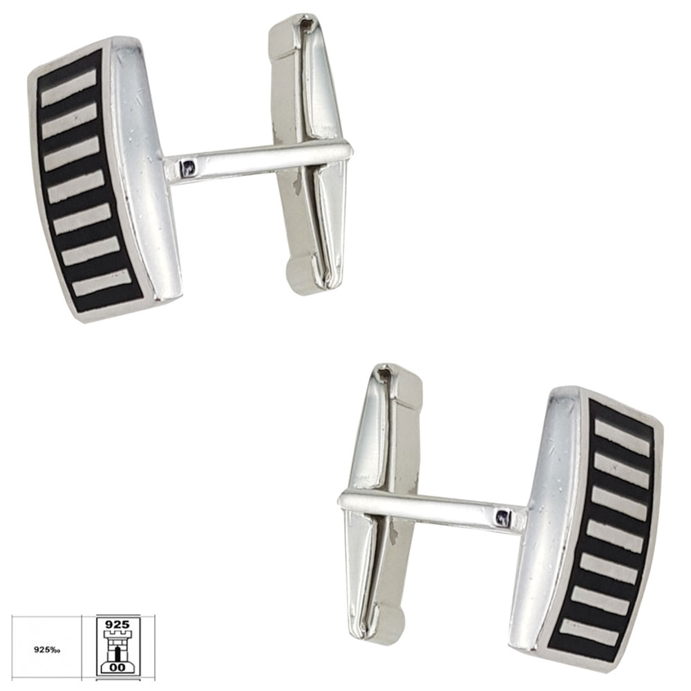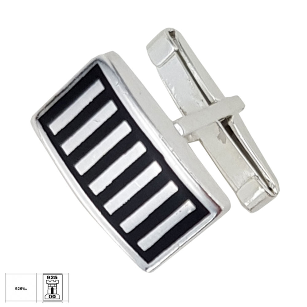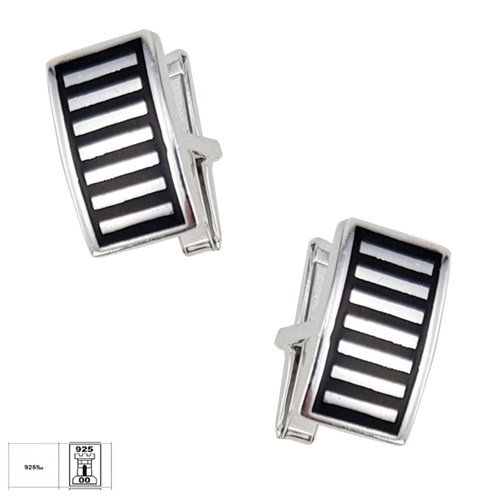 Adauga un plus de rafinament tinutelor tale cu butonii din argint 925 Rows, creati pentru barbatii care apreciaza detaliile fine si designul modern. Acesti butoni au o forma dreptunghiulara si sunt decorati cu un model geometric format din linii verticale, incadrate armonios pe un fundal din email negru, oferind un contrast vizual puternic si elegant.