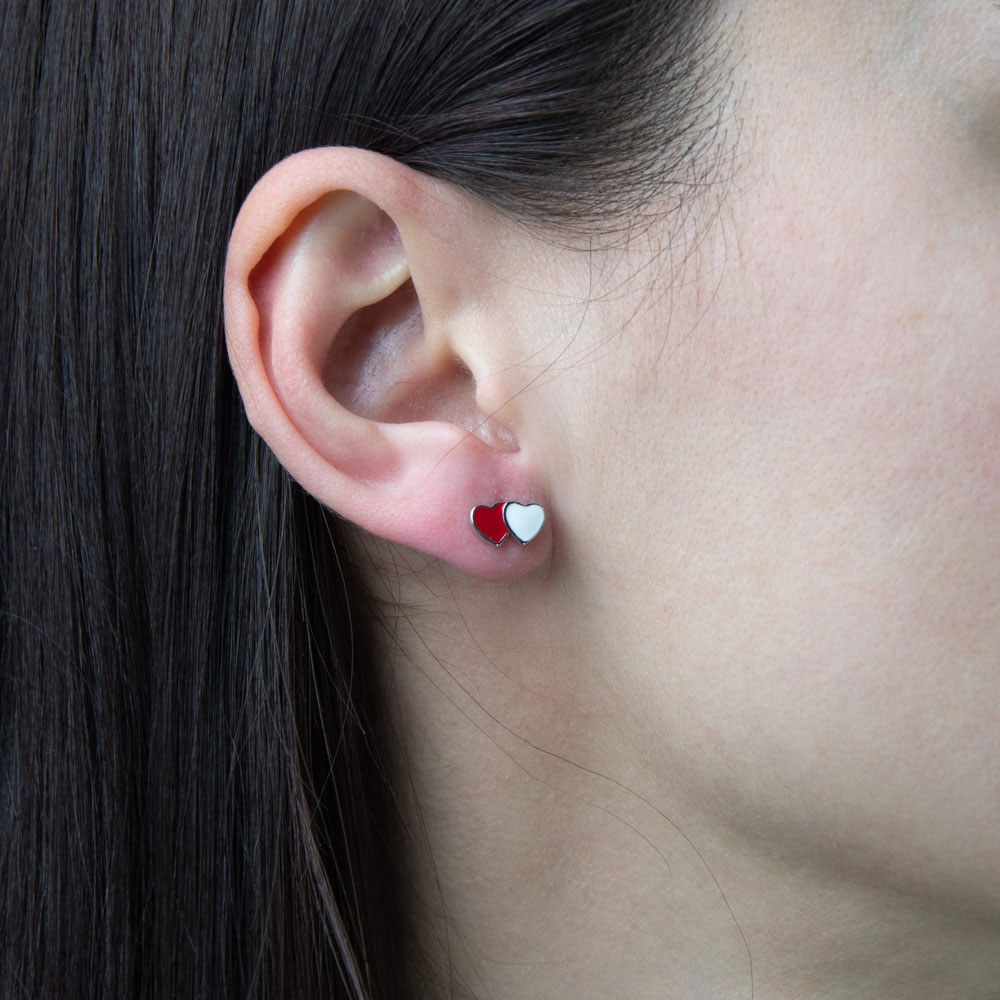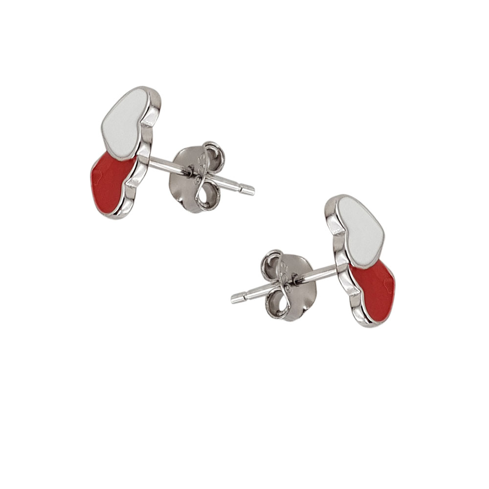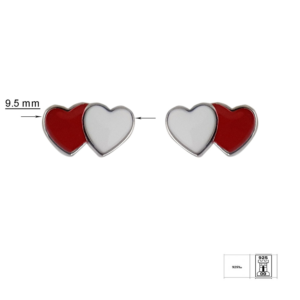 Cercei din argint 925, doua inimi cu email, rosu si alb. Sistem de inchidere surub.