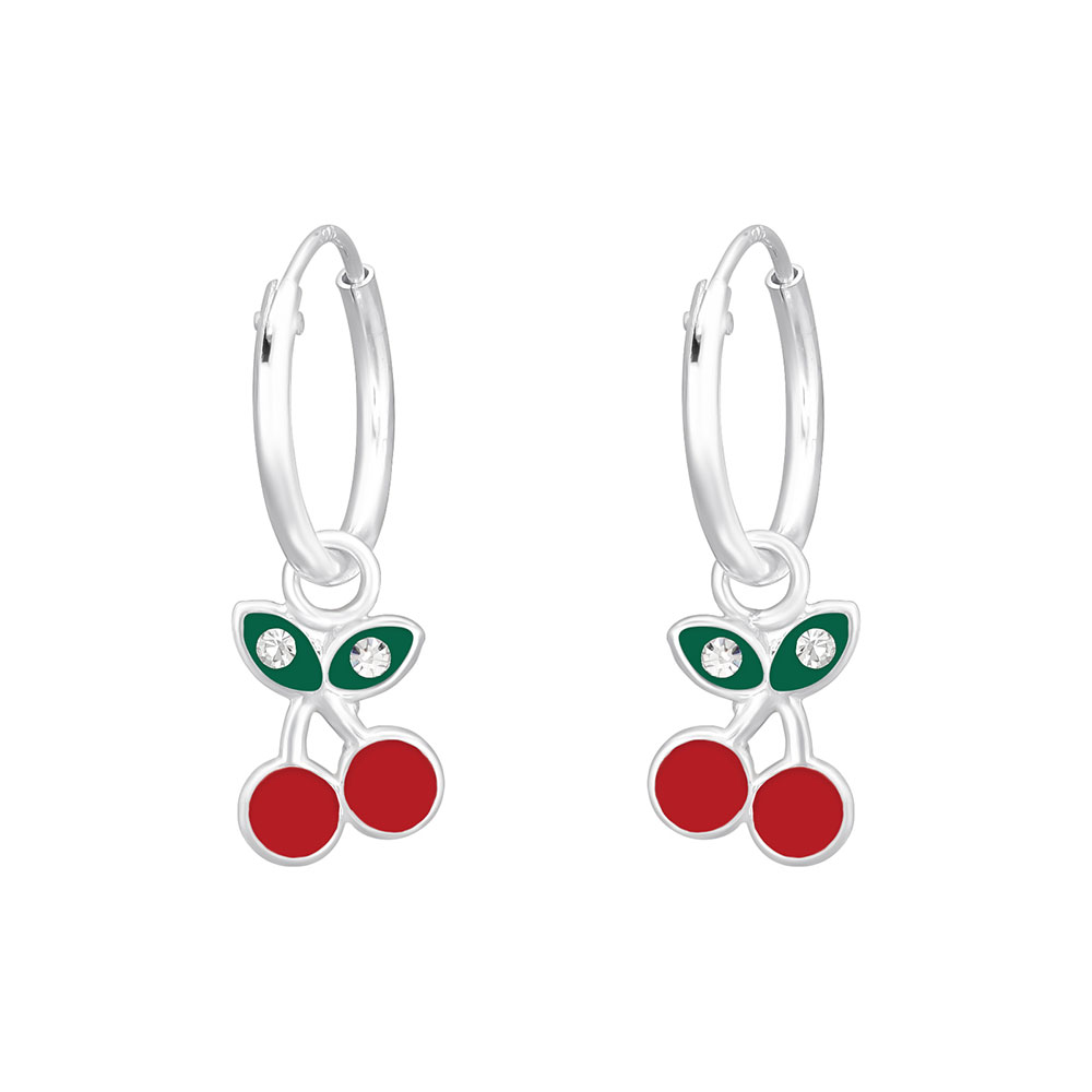 Cercei din argint 925 pentru copii model veriga cu cireasa cu email rosu si verde atarnata. Cerceii au inchidere cu arc.