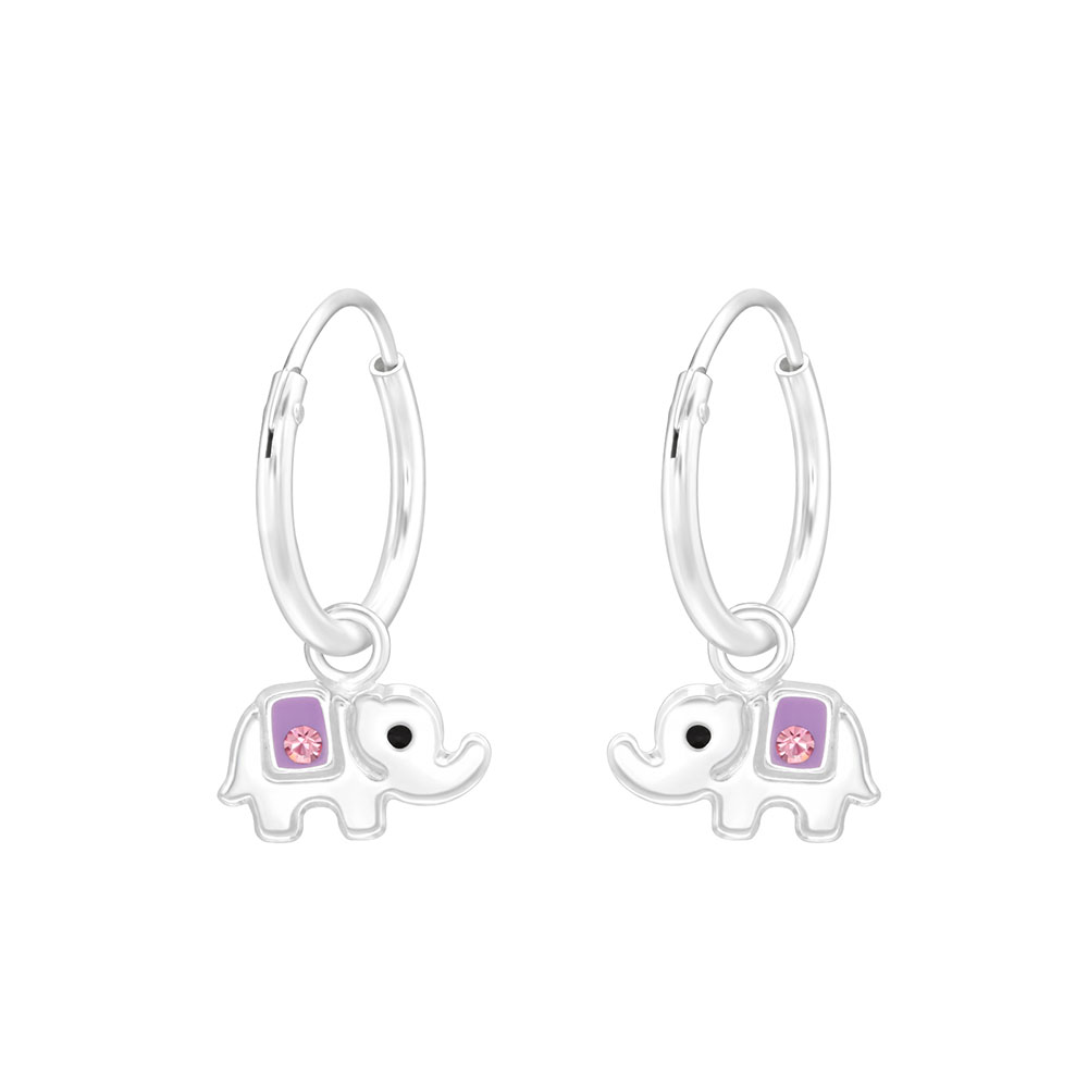 Cercei argint 925 pentru copii model creola cu un elefantel decorat cu un zirconiu roz. Cerceii au inchidere cu arc.
