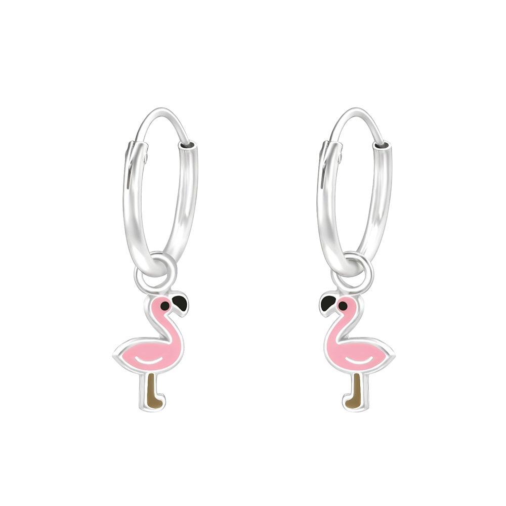 Cercei din argint 925 pentru copii, model creole cu flamingo, decorati cu email roz. Cerceii au inchidere cu arc.