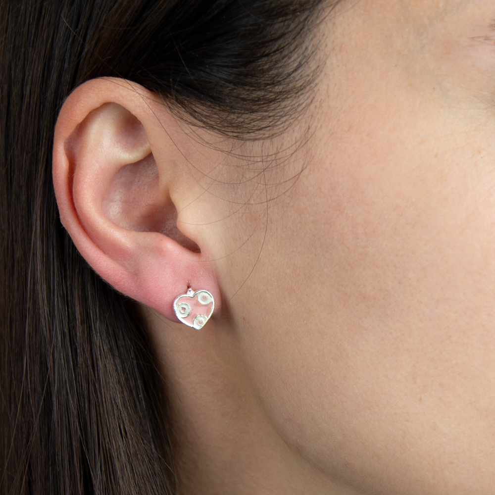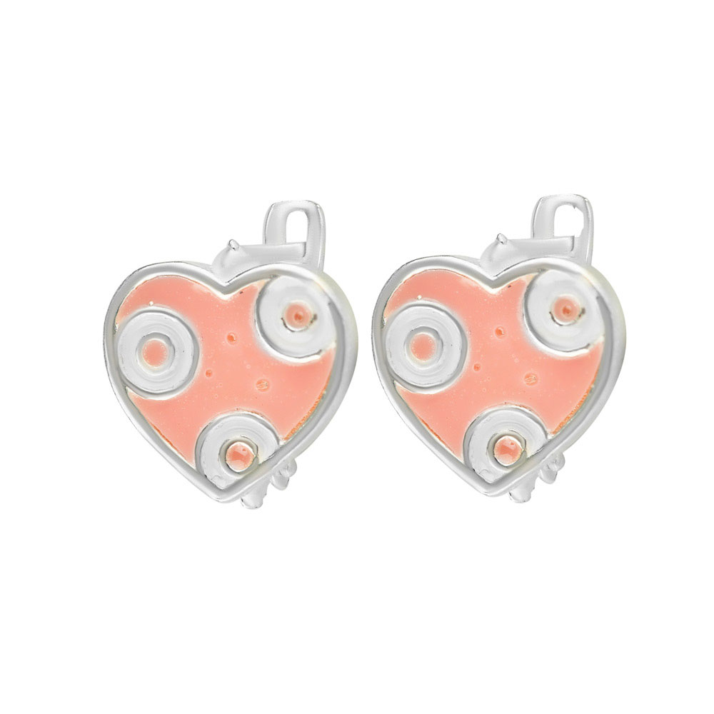 Cercei din argint 925, pentru copii, forma inima, decorati cu email roz si alb. Cerceii au inchizatoare englezeasca.