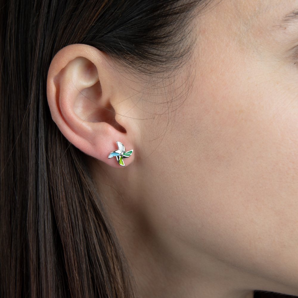 Cercei din argint 925, pentru copii, forma morisca, decorati cu email multicolor. Sistemul de inchidere este prevazut cu surub pentru a impiedica deschiderea accidentala si pierderea cerceilor, iar capacelul acopera complet tija si este rotunjit pentru a preveni inteparea.