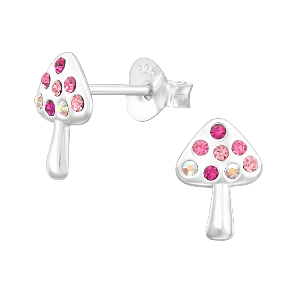 Cercei din argint 925 pentru copii ciupercute decorate cu zirconii roz. Cerceii se inchid cu surub.