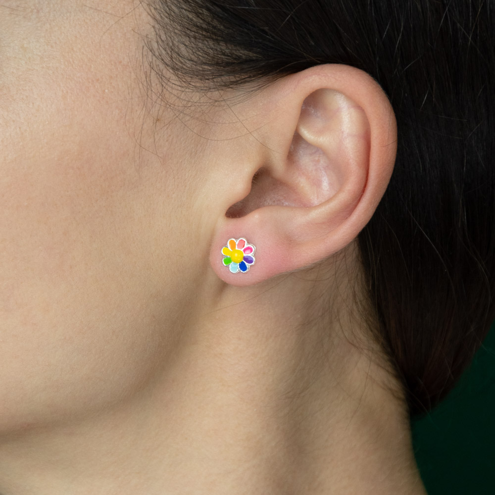Cercei din argint 925 pentru copii, model floare, decorati cu email multicolor. Cerceii se inchid cu surub.