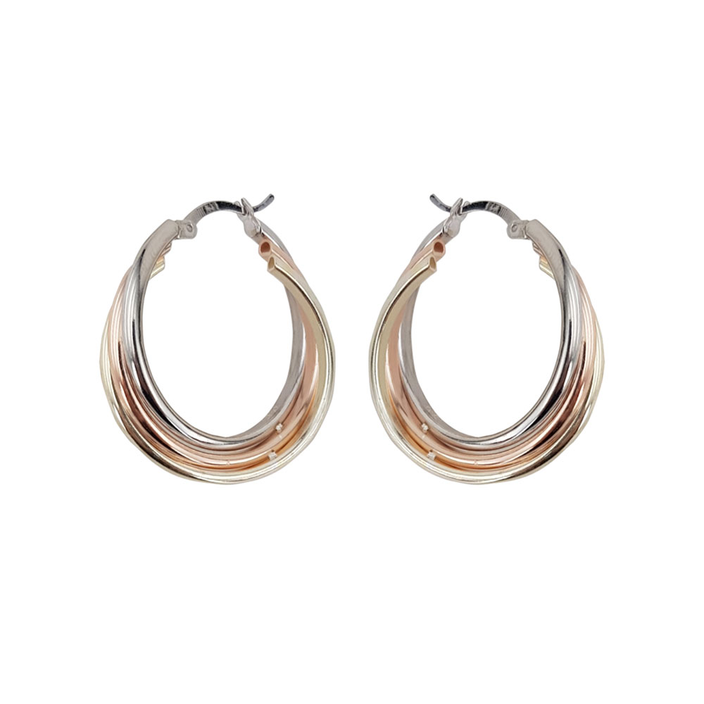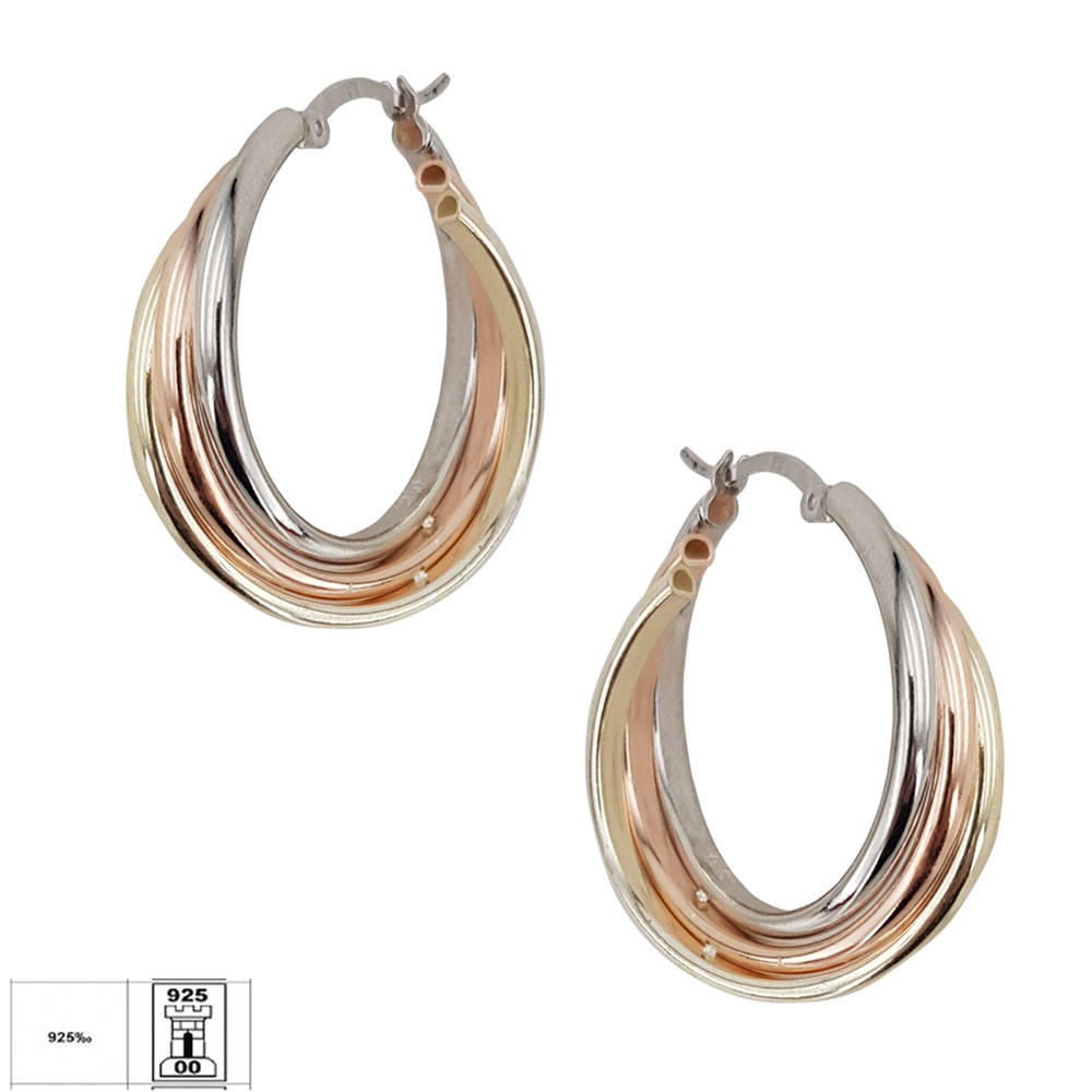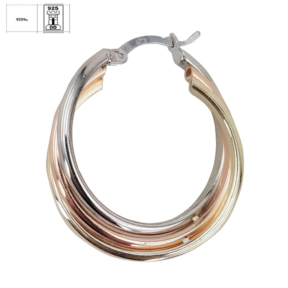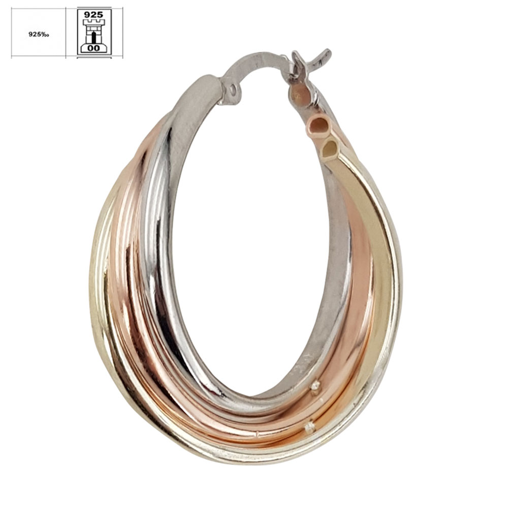 Cerceii Trio din argint 925 reprezinta o alegere rafinata pentru femeile care apreciaza eleganta subtila si versatilitatea designului contemporan. Creati din argint 925 autentic, acesti cercei creola impresioneaza prin combinatia armonioasa a trei nuante: argintiu clasic, auriu cald si rose delicat, perfect integrate intr-un model usor rasucit.