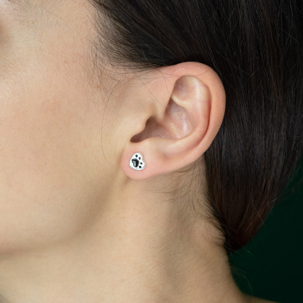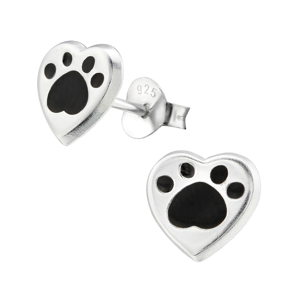 Cercei din argint 925, forma de inima, gravati cu email negru in urma de labuta. Se inchid cu surub.
