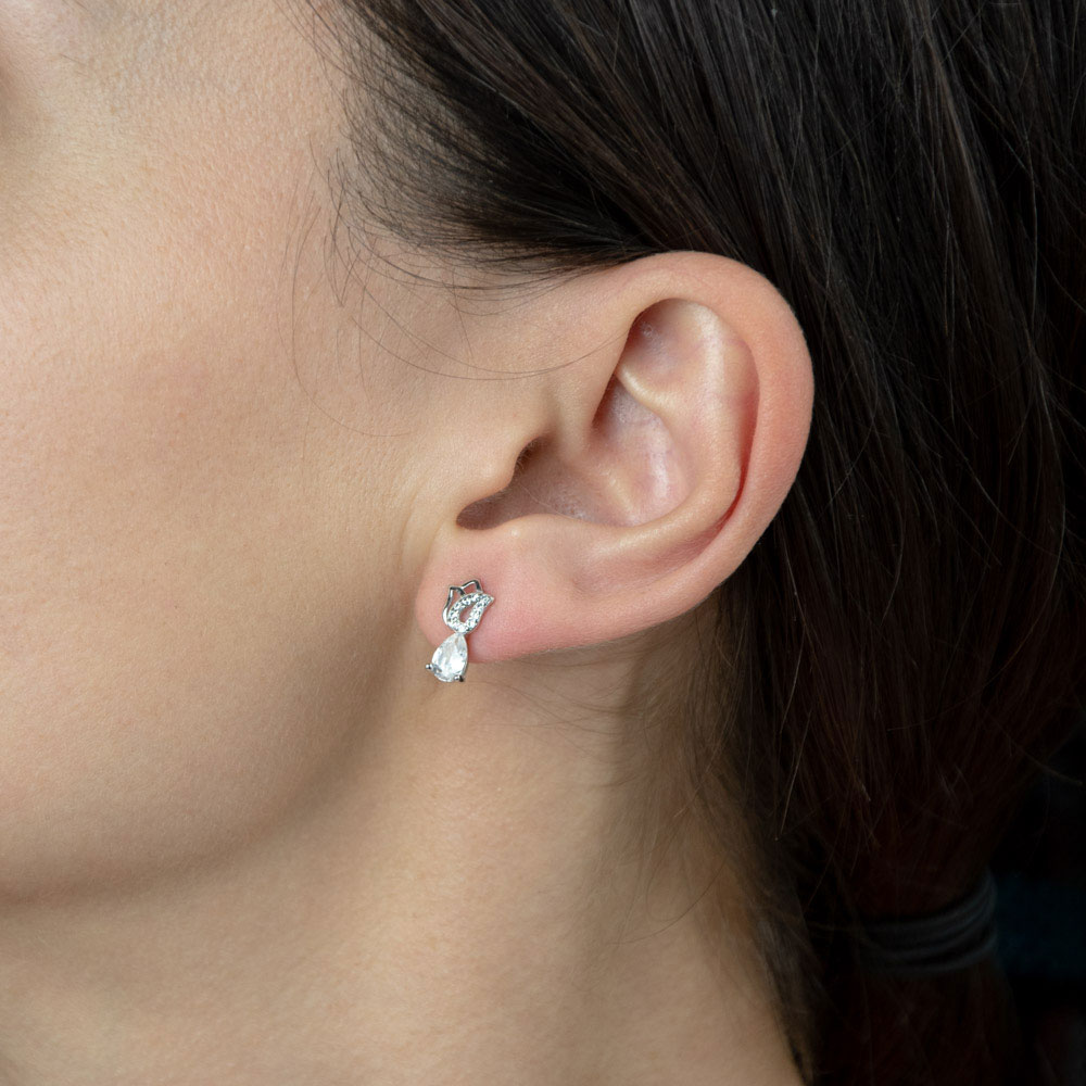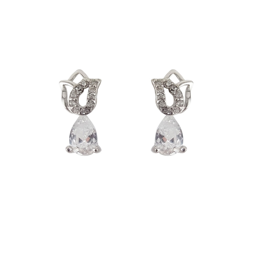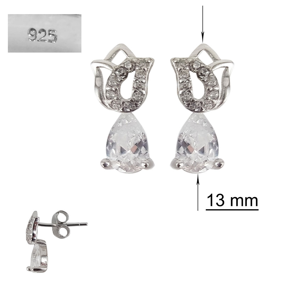 Cercei din argint 925, cu surub, in forma de lalea cu o prelungire din zirconiu alb in forma de lacrima. Dimensiune 12/6 mm. Produsul este marcat in conformitate cu normele in vigoare. E livrat in plic sau cutie de bijuterii.