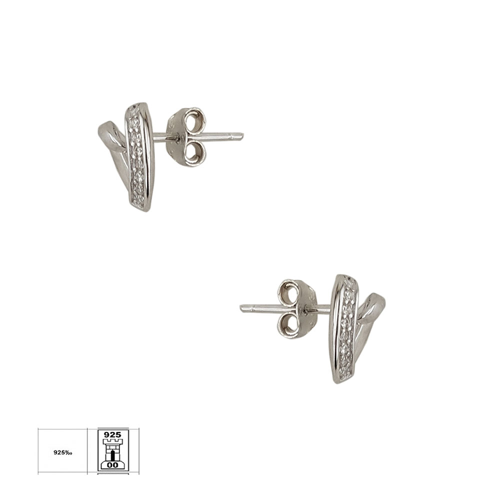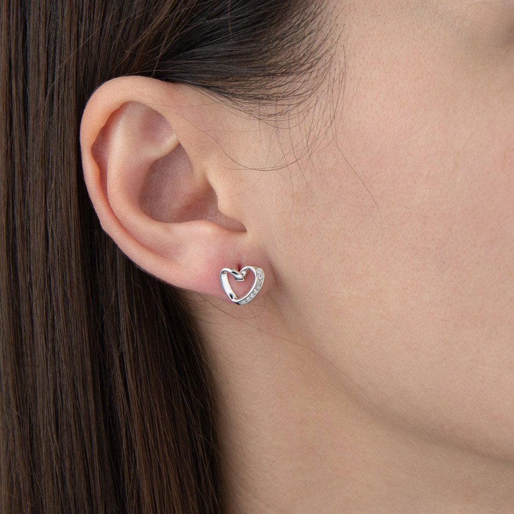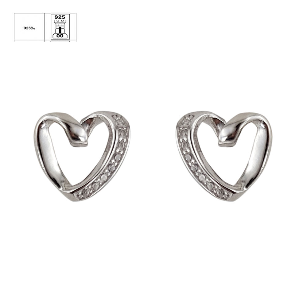 Cercei din argint 925 model inima decupata cu zirconii albe pe o parte. Cerceii se inchid cu surub.