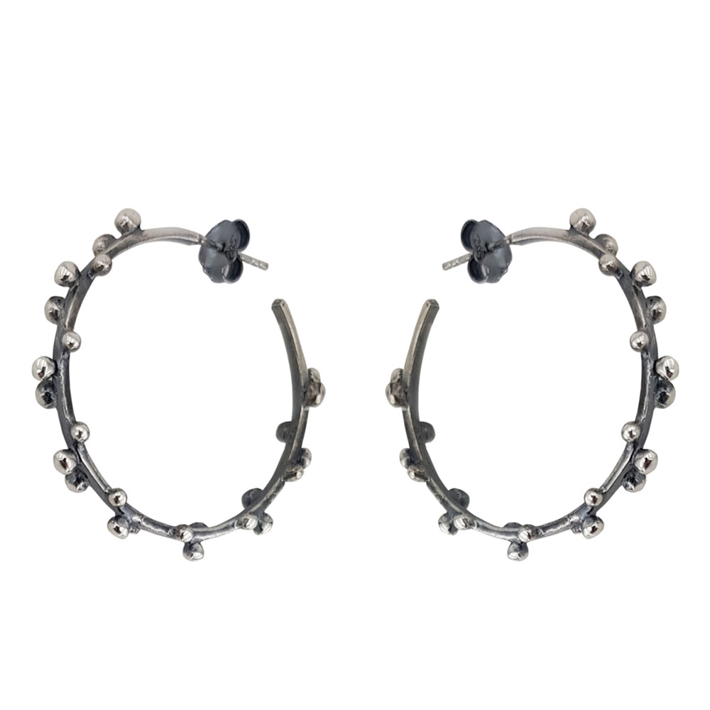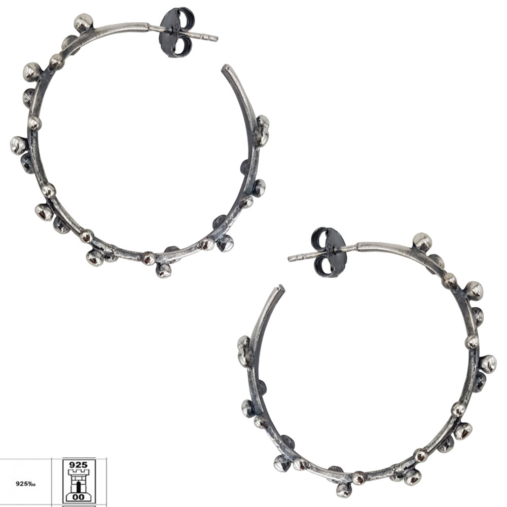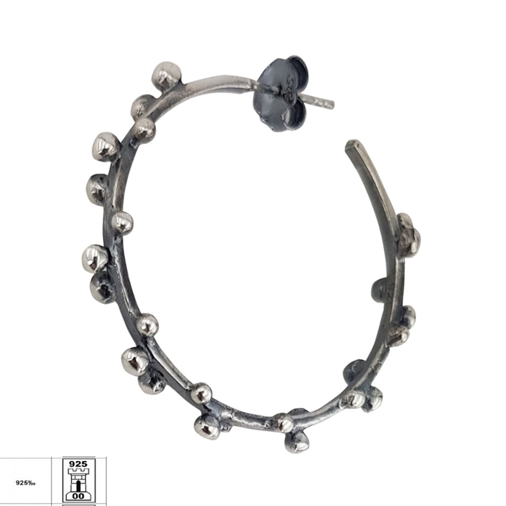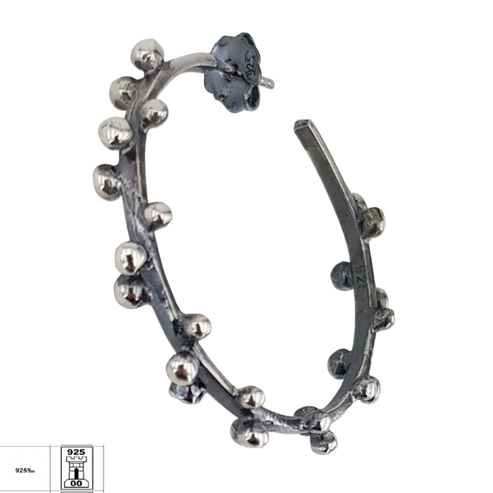 Exprima-ti stilul personal cu cerceii din argint 925 innegrit Taly, o alegere rafinata pentru femeile care apreciaza bijuteriile cu personalitate. Acest model de tip creola se remarca prin aspectul sau vintage, accentuat de finisajul innegrit si detaliile sub forma de bilute delicate, distribuite uniform de-a lungul cercului.