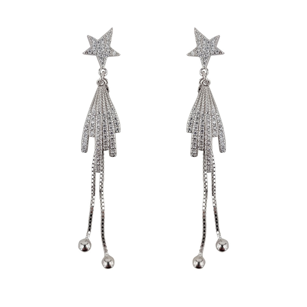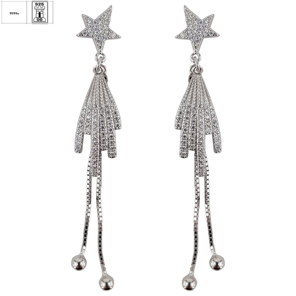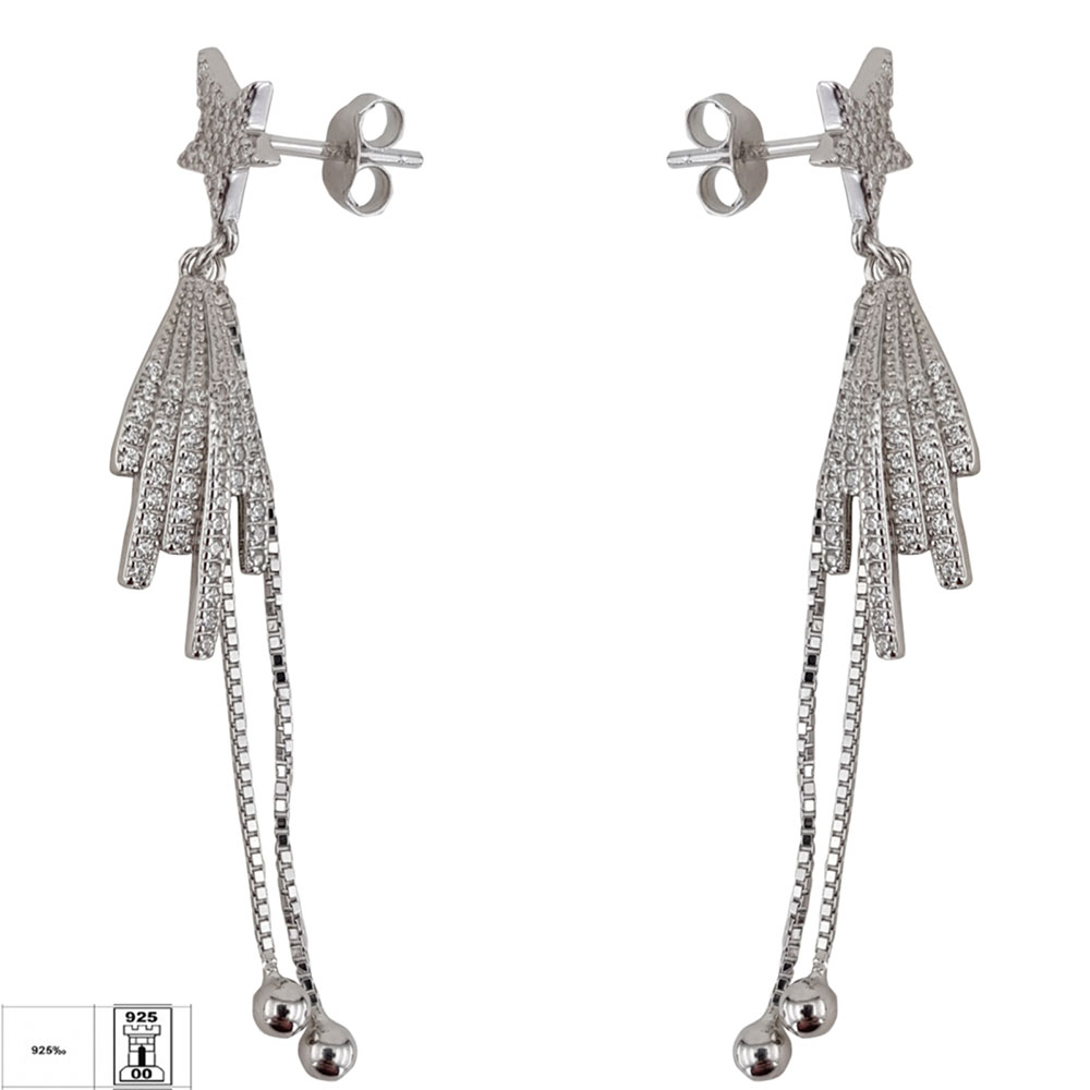 Designul cerceilor este inspirat de stelele cazatoare, simbol al dorintelor si elegantei discrete. Stelutele fine incrustate cu zirconii albe capteaza lumina din orice unghi, adaugand un plus de stralucire chipului tau. Lantisoarele subtiri, terminate cu bilute lucioase, confera dinamism si miscare, accentuand feminitatea purtatoarei.