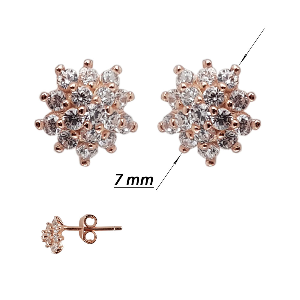 Cercei din argint 925, placati in nuanta rose-gold, model floare, decorati cu zirconii albe. Cerceii se inchid cu surub.