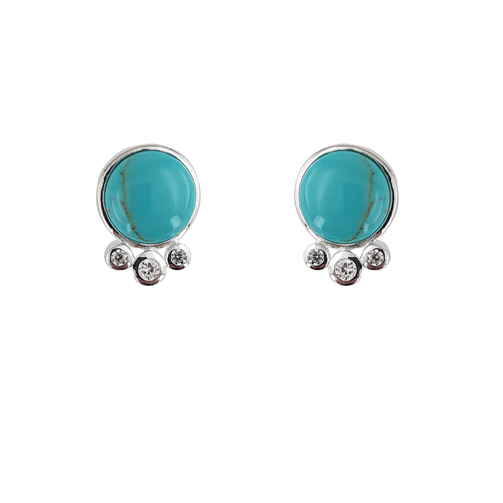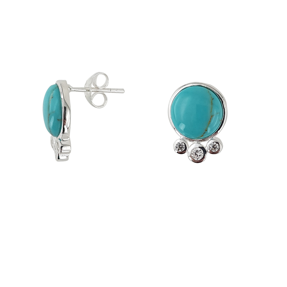 Cercei din argint 925, decorati cu zirconii albe si turcoaze. Cerceii se inchid cu surub.