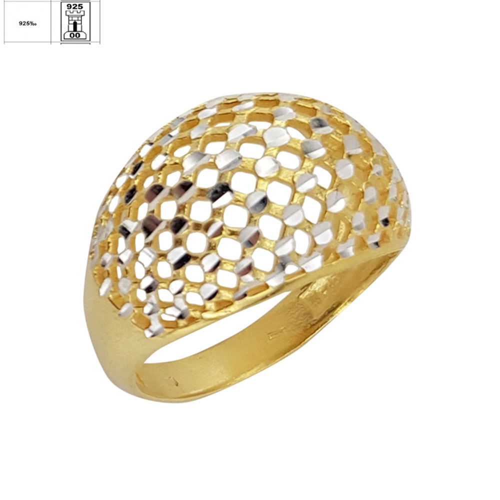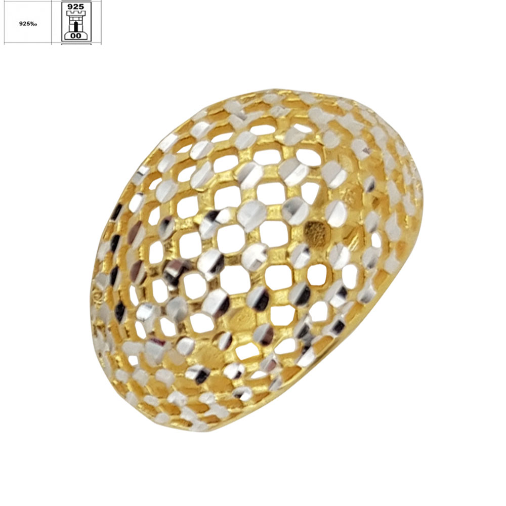 Inelul Bomb din argint 925 placat cu aur este o alegere rafinata pentru femeile care apreciaza bijuteriile deosebite si durabile. Acest model se remarca prin designul filigran de tip plasa, lucrat cu atentie la detalii, ce creeaza un efect vizual elegant si sofisticat. Montura bombata adauga volum si prezenta, transformand inelul intr-o piesa statement, ideala pentru tinute moderne sau clasice.