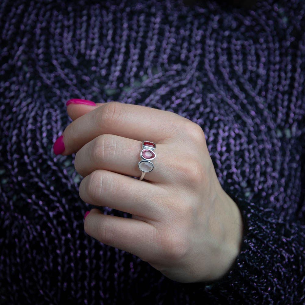 Cele trei cristale in nuante placute de roz sunt meticulos incrustate pentru a capta si reflecta lumina, creand un efect vizual spectaculos. Realizat din argint 925, acest inel nu doar ca se distinge prin designul sau modern, dar este si durabil, fiind perfect pentru utilizarea zilnica.