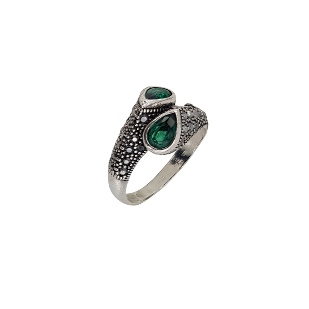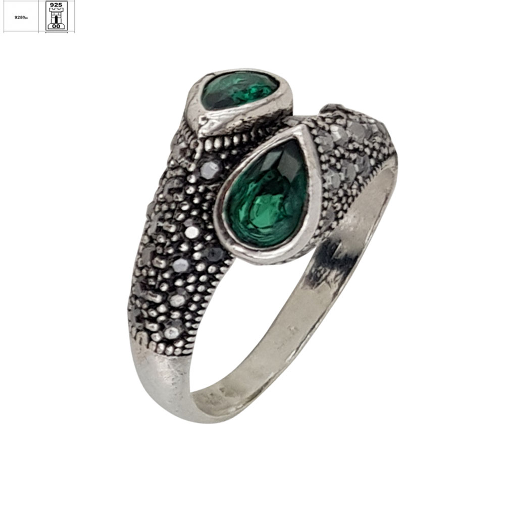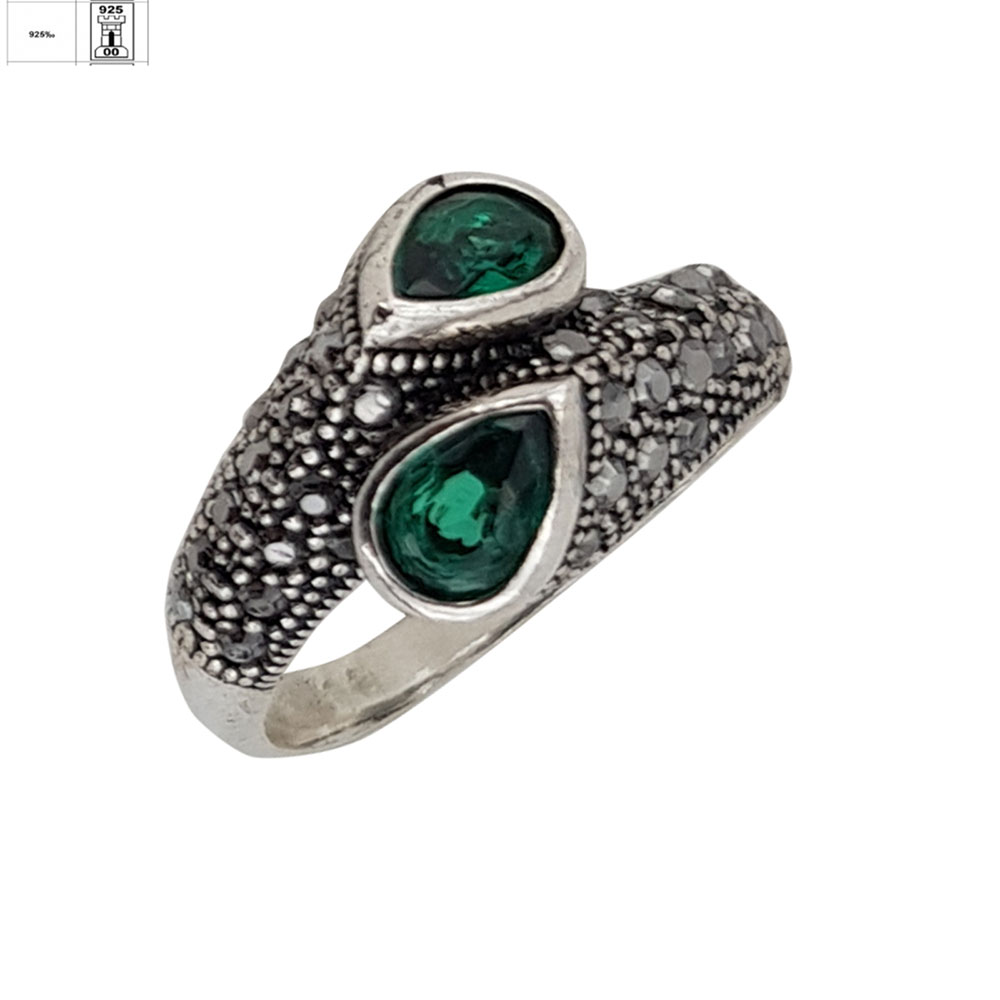 Designul in forma de sarpe este inspirat din mitologie si semnifica transformare si putere, iar montura este accentuata de doua zirconii lacrima in nuante intense de verde, pozitionate la extremitati pentru un efect vizual captivant. Textura bogata a suprafetei este data de hematite patinate, oferind profunzime si un aer vintage sofisticat.