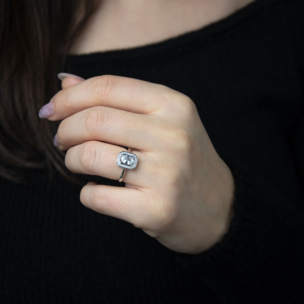 Explorati farmecul si rafinamentul inelului de logodna Thia din argint 925, o piesa centrala impresionanta pentru orice colectie de bijuterii. Acest inel splendid prezinta un zirconiu alb central dreptunghiular inconjurat de zirconii mici, oferind un aspect stralucitor si captivant.