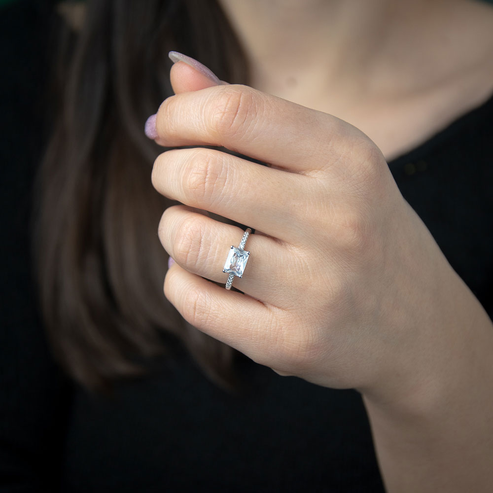 Descopera frumusetea stralucitoare a Argintului 925 cu inelul de logodna Thia, care imbina clasicul cu modernul intr-o piesa de bijuterie de exceptie. Designul elegant, accentuat de un zirconiu alb de forma dreptunghiulara plasat central, este completat de zirconii albe minuscule, aranjate cu maestrie pentru a adauga o nota de stralucire suplimentara.
