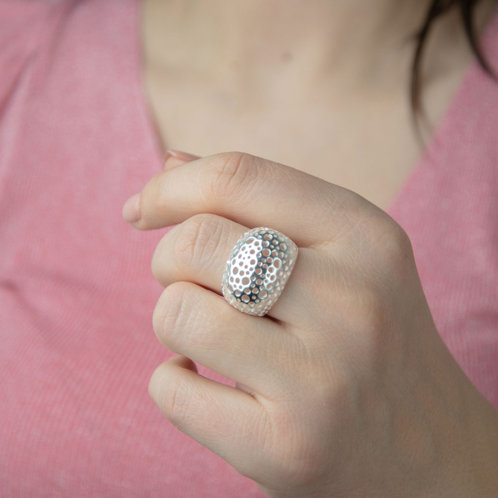 Descoperiti inelul din argint 925 care imbina cu maestrie eleganta si designul contemporan. Acest inel masiv, cu un profil bombat si margini rotunjite, este definitia stilului impunator, oferind o nota de sofisticare oricarei tinute.