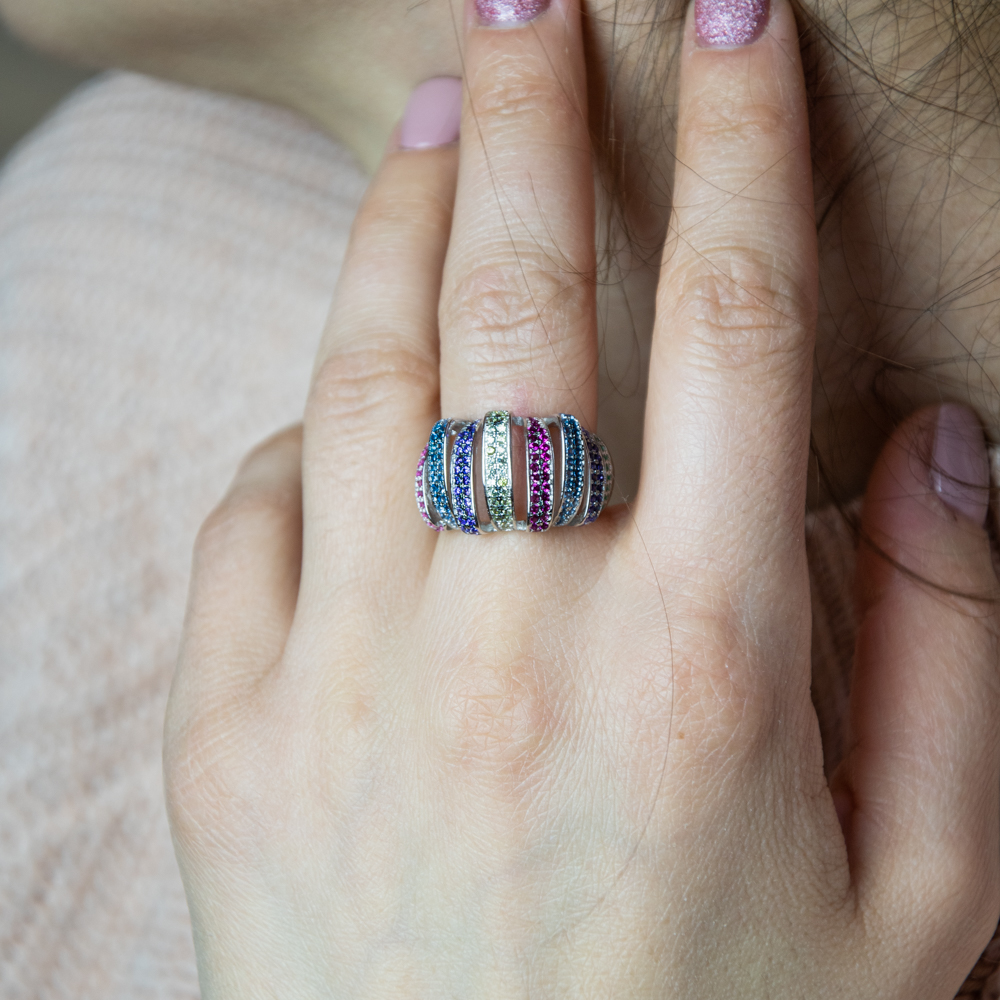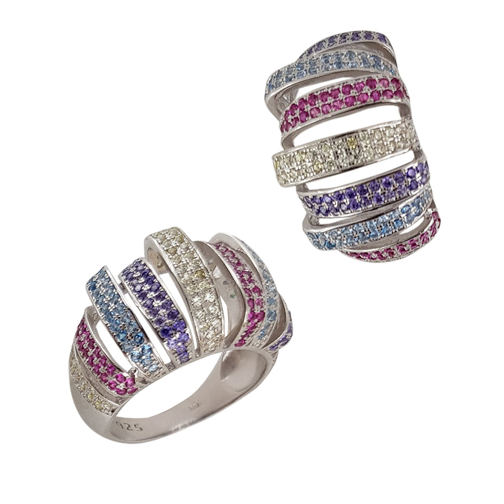 Adauga o nota de eleganta si rafinament colectiei tale de bijuterii alegand inelul din argint 925 masiv Feeria. Cu un design fashion si unic, acest accesoriu special este decorat cu zirconii stralucitoare multicolore, perfect pentru orice tinuta moderna. Realizat din argint 925, acest inel reprezinta garantia calitatii, durabilitatii si stralucirii de durata.