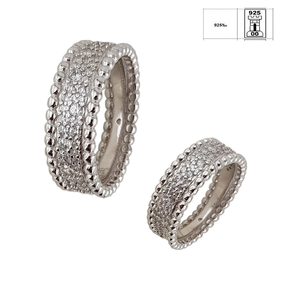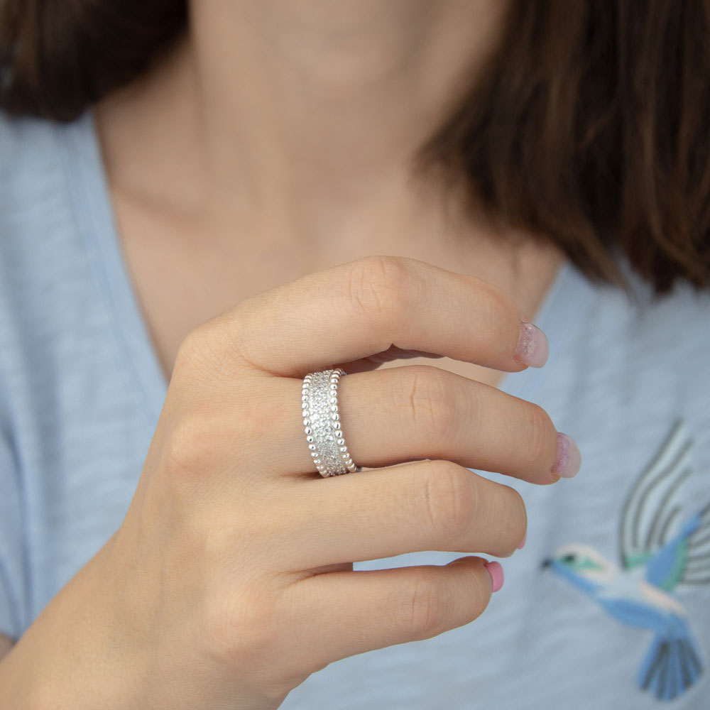 Design-ul inelului Thia prezinta o serie de zirconii mici, fiecare meticulos incrustat pentru a oferi stralucire maxima. Marginea este decorata cu un sir de bilute din argint, adaugand o textura deosebita si un contrast placut vizual.