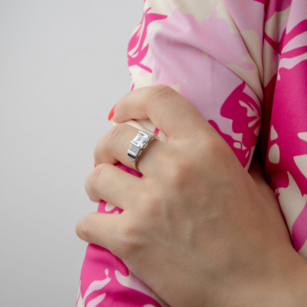 Explorati eleganta si rafinamentul cu Inelul Thia din Argint 925, o piesa centrala in colectia noastra de bijuterii. Designul sau unic este definit de un zirconiu patrat central, amplasat strategic pentru a maximiza stralucirea si impactul vizual. Pe langa acesta, inelul este imbracat in zirconii mici, distribuite pe laturile sale, fiecare contribuind la un efect de luminozitate remarcabil.