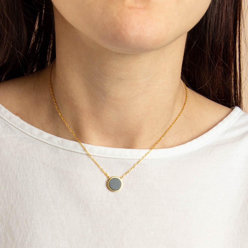 Explorati frumusetea si eleganta cu Lantul argint aurit cu email negru Saima, o piesa rafinata de bijuterie ce emana stil si clasa. Fabricat in Italia, acest lant din argint 925 rodiat prezinta un finisaj aurit de inalta calitate, accentuat de un pandantiv circular cu email negru, ce masoara 12 mm in diametru.
