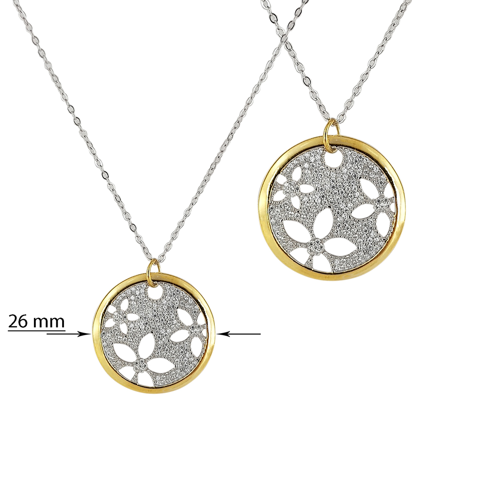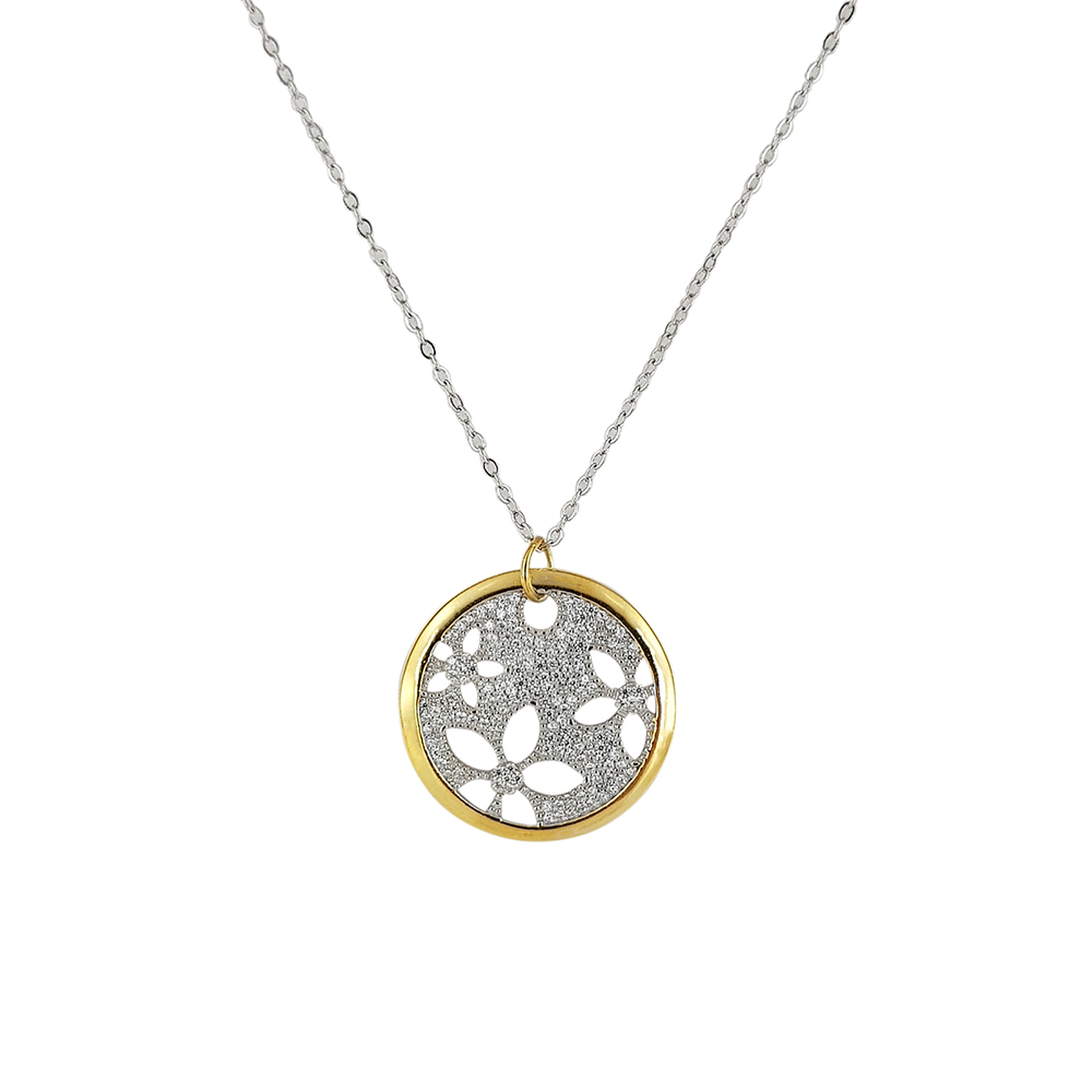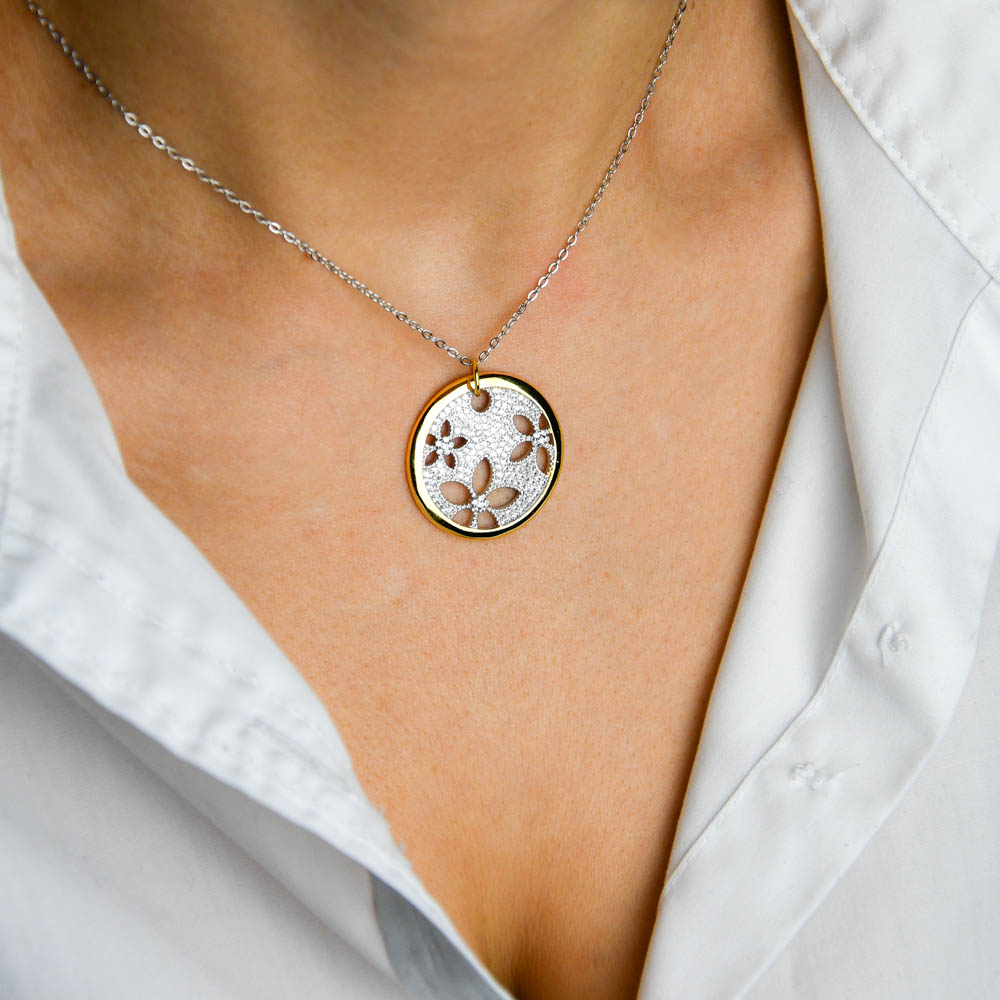 Pandantivul rotund, cu diametrul de 26 mm, prezinta decupaje artistice in forma florala, accentuate prin marginea aurie ce ii confera un aspect elegant, perfect atat pentru tinute casual, cat si pentru evenimente speciale. Lantul subtire de 1 mm latime si 45 cm lungime asigura confortul optim pentru purtare zilnica.