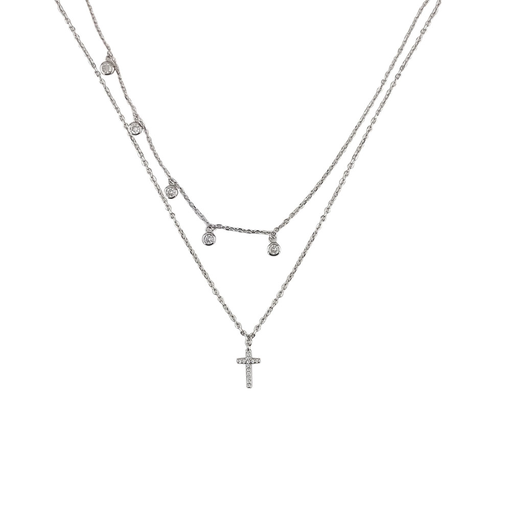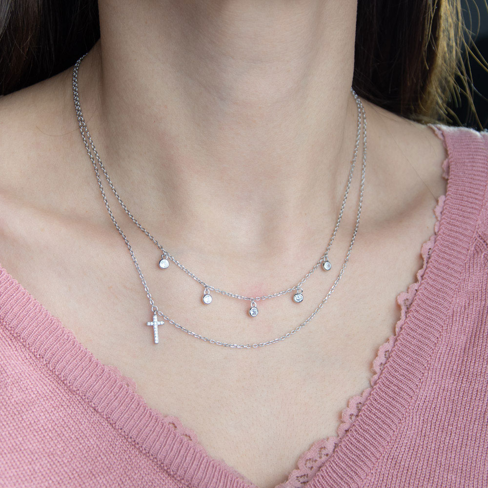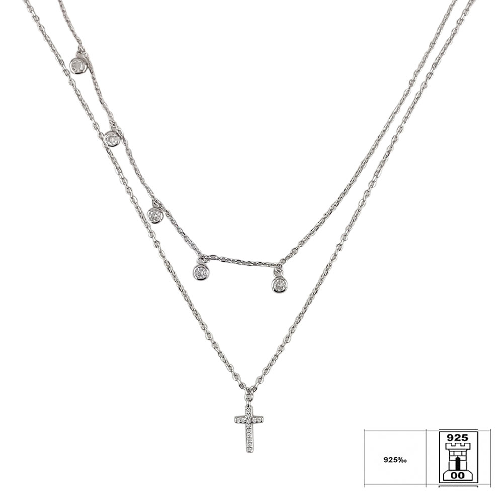 Exprima-ti eleganta si stilul unic alegand un lant dublu din argint 925 cu pandantiv in forma de cruciulita decorata cu zirconii albe. Conceput pentru femeile rafinate, acest accesoriu pretios imbina designul modern cu delicatetea specifica bijuteriilor din argint. Produsul are doua lanturi de lungimi diferite (41 cm si 43 cm), oferind un efect estetic special si elegant la purtare.