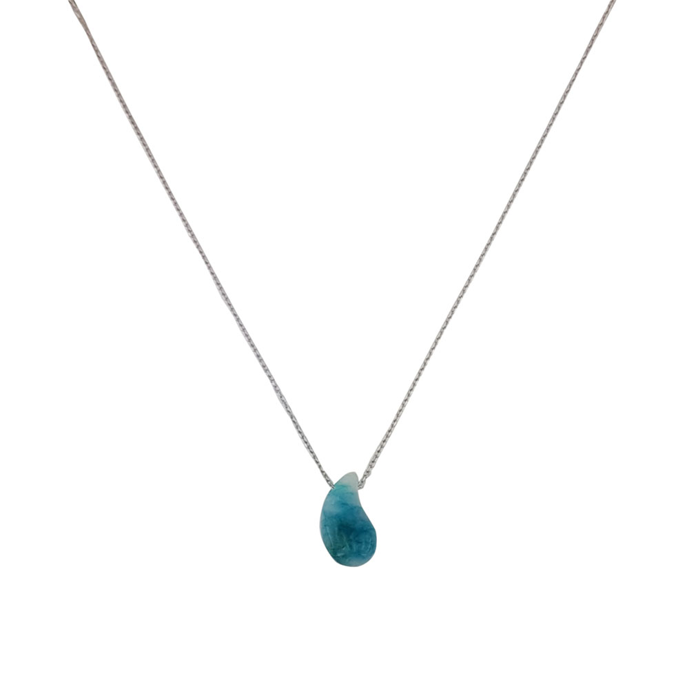 Punctul central al bijuteriei este pandantivul in forma de virgula, lucrat cu atentie si montat cu o piatra Larimar naturala, recunoscuta pentru nuantele sale azurii si efectul calmant pe care il transmite. Fiecare piatra este unica, cu modele organice ce amintesc de valurile oceanului, oferind astfel o nota distinctiva fiecarei bijuterii.