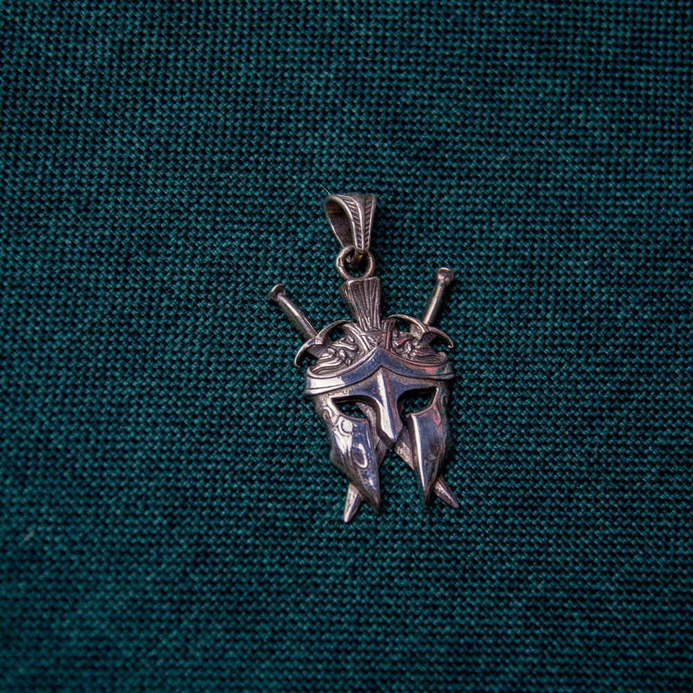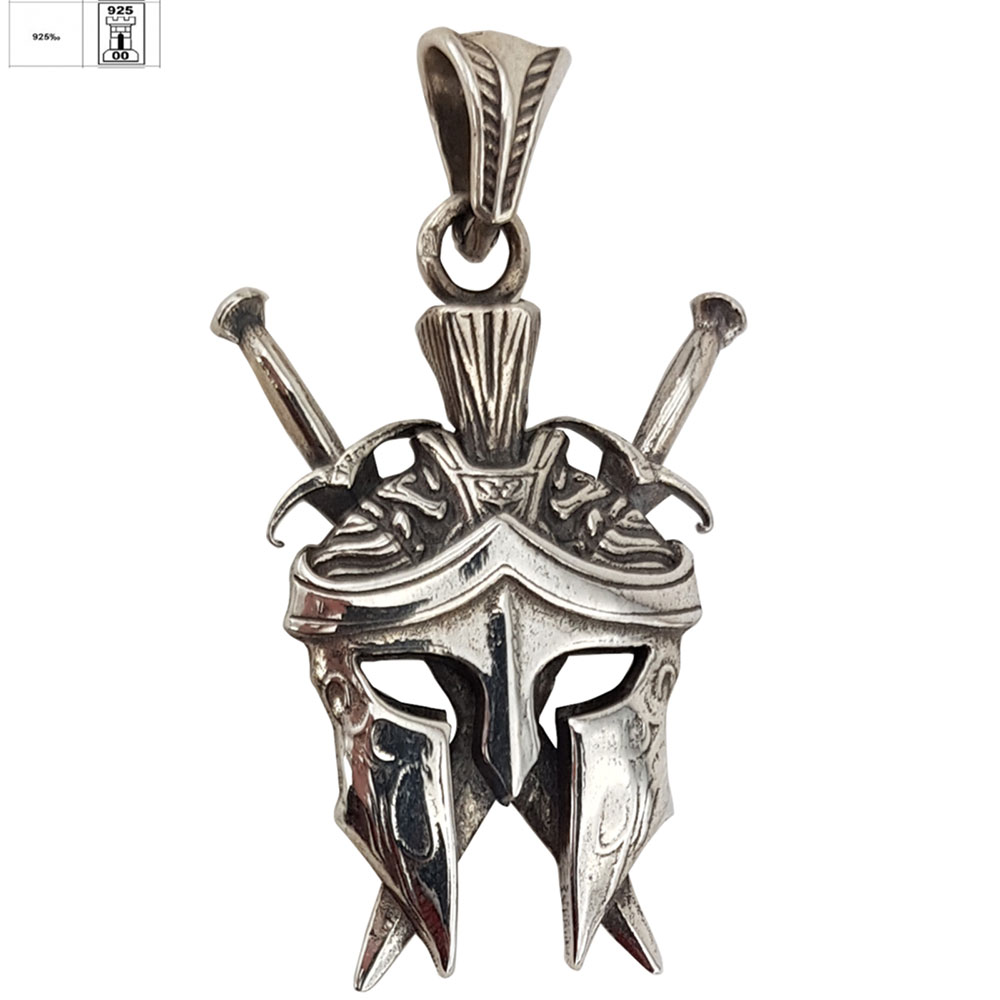 Cu un design impunator, acest pandantiv are in centru un coif atent sculptat, completat armonios de doua sabii incrucisate, accentuand imaginea puterii si a onoarei. Fara pietre pretioase, finisajul argintiu ii ofera eleganta subtila, iar dimensiunile generoase (45 mm lungime si 26 mm latime) il fac vizibil si distinctiv.