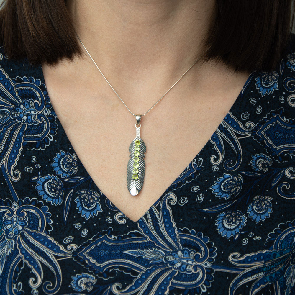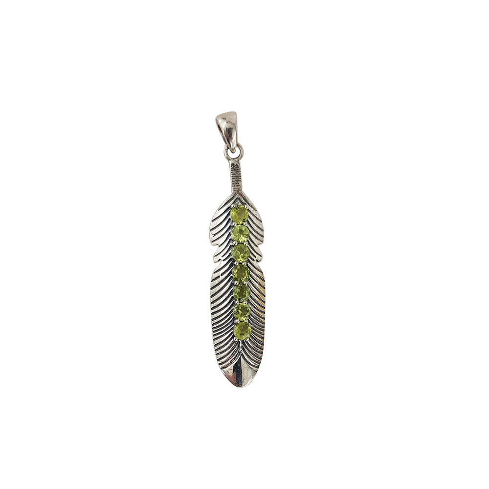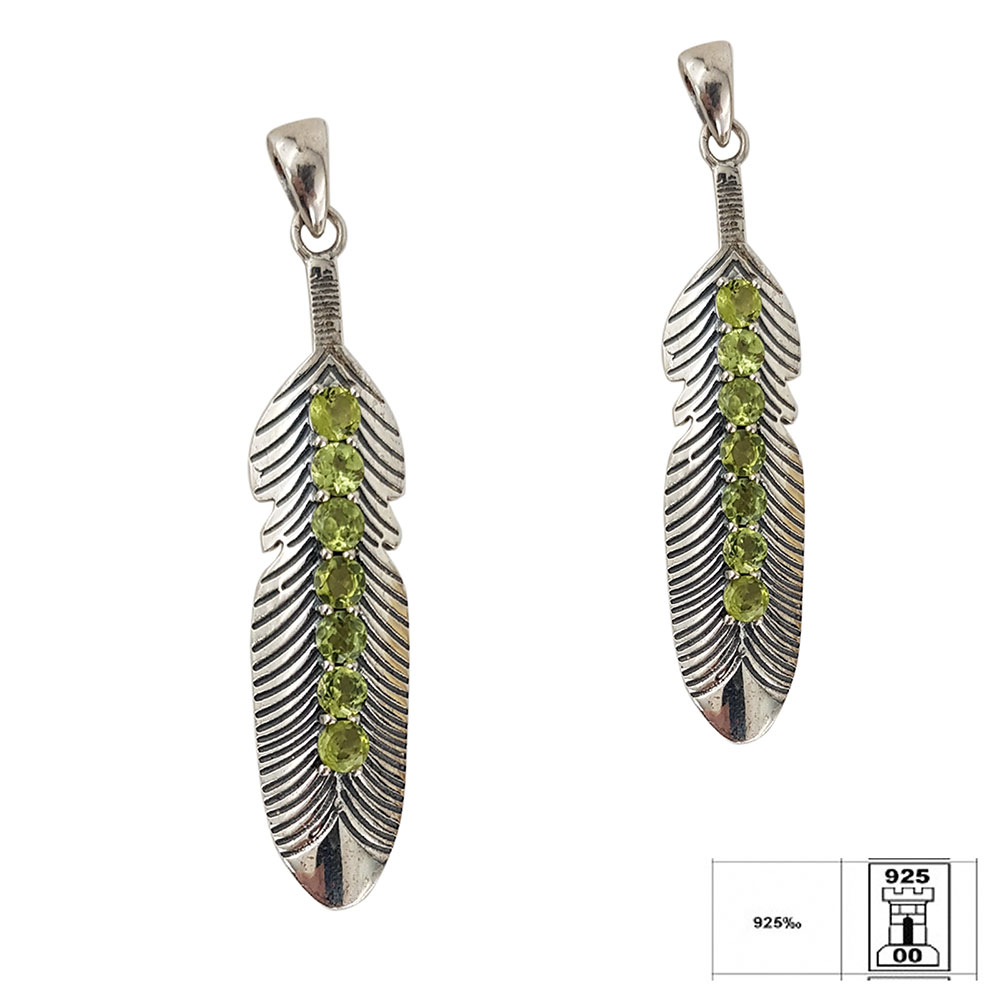 Adauga o nota de rafinament tinutei tale cu acest pandantiv din argint 925, lucrat manual cu atentie desavarsita. Designul sau in forma de pana aduce un aer delicat si feminin, completat armonios de pietrele stralucitoare de peridot verde, cunoscut pentru proprietatile sale energetice pozitive.