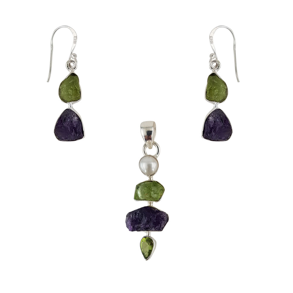 Acest set nu este doar un accesoriu, ci o piesa de arta ce poate fi purtata in diverse combinatii, fie ca optati pentru un look casual sau unul mai sofisticat. Ametistul si peridotul aduc un plus de culoare si vibrativitate, in timp ce perla baroca adauga un strop de clasicism si eleganta.