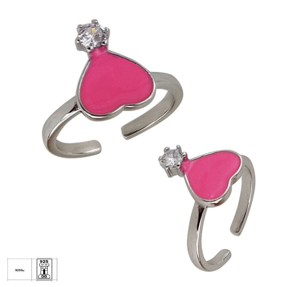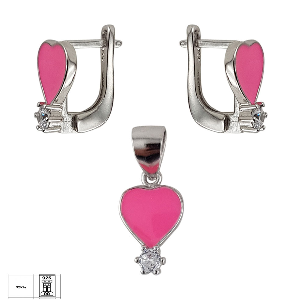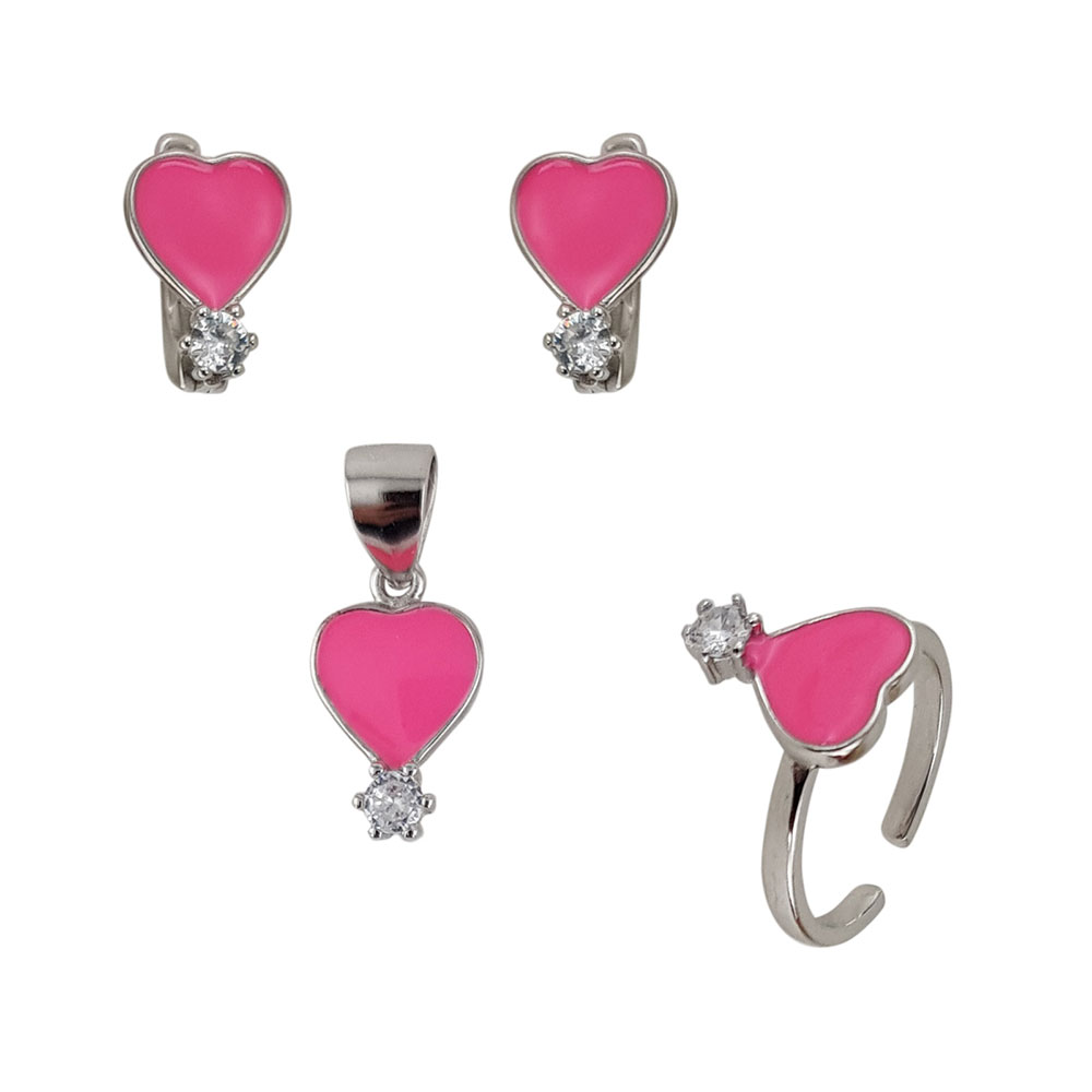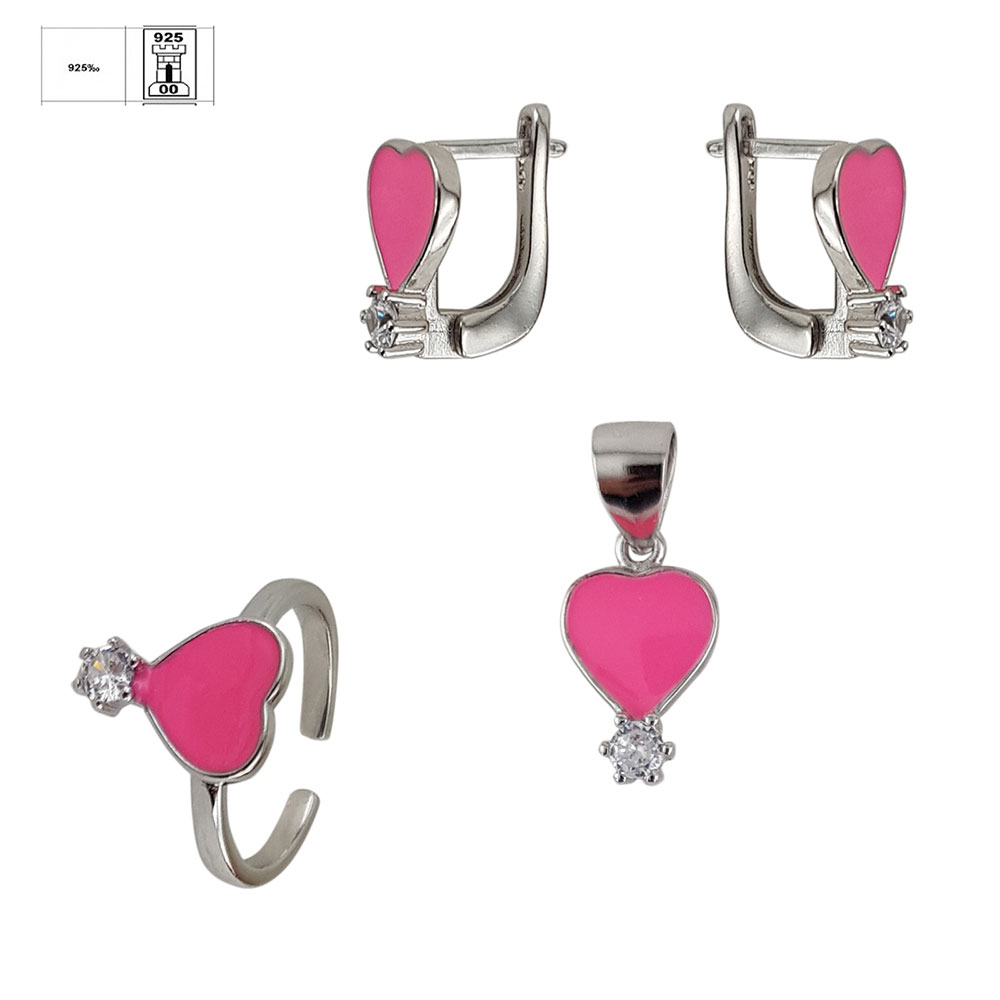 Set din argint 925, format din cercei, inel si pandantiv in forma de inima cu email roz si zirconiu alb. Inel reglabil.