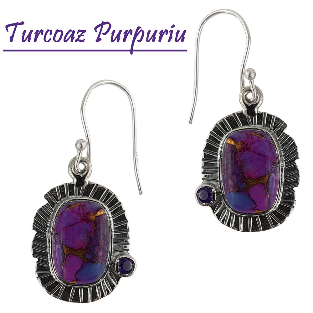 Cerceii cu agatatoare elegante si pandantivul sunt finisate cu turcoaz purpuriu, fiecare piatra fiind unica prin nuantele sale vibrante si textura. Culorile intense si designul artistic fac din acest set alegerea perfecta pentru orice garderoba, adaugand o pata de culoare si sofisticare.