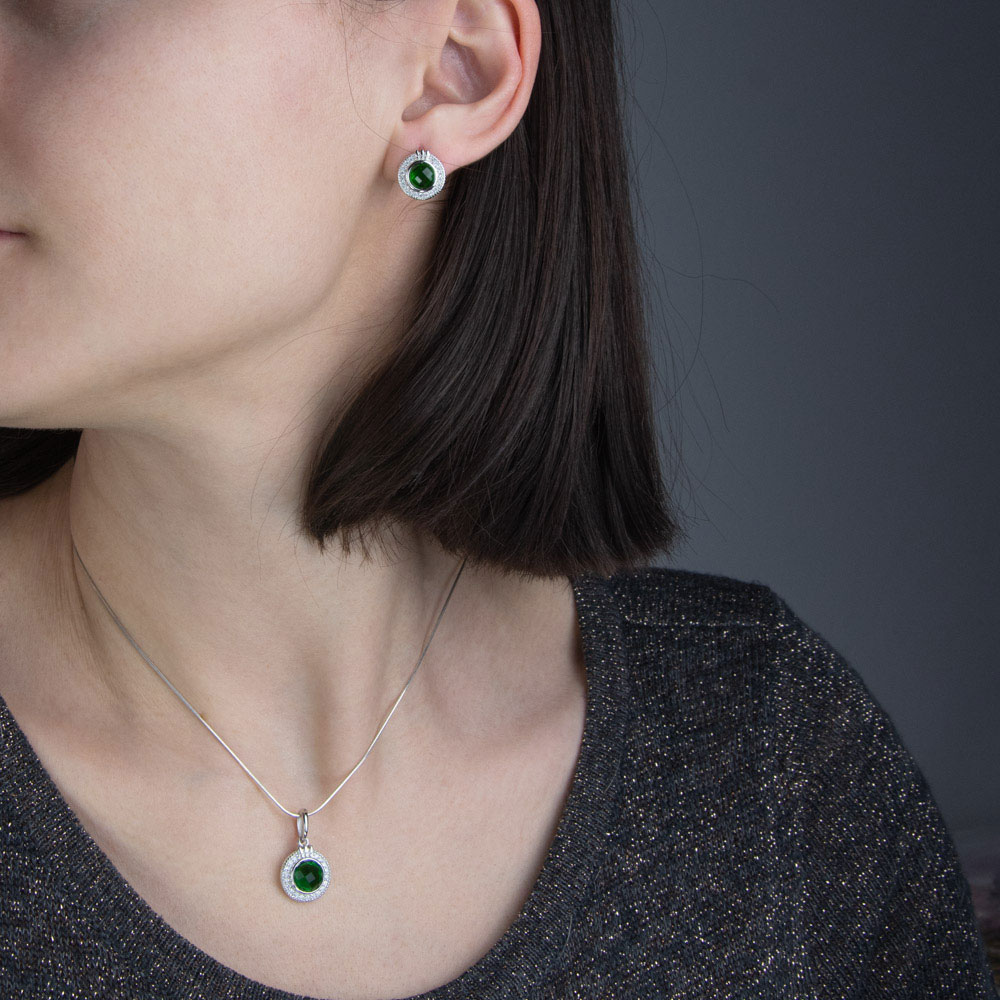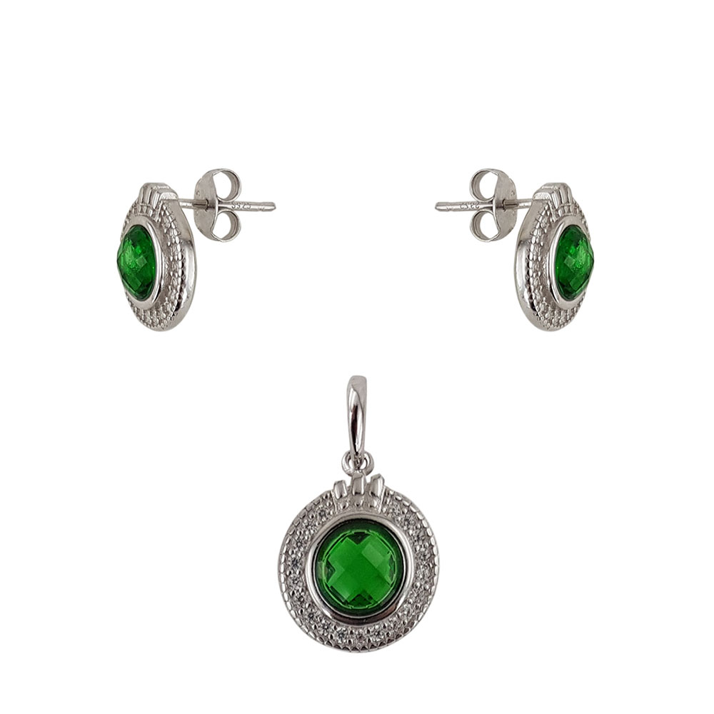 Exprima-ti eleganta cu setul nostru exclusiv Reya, compus din cercei si pandantiv din argint 925. Acest set imbina rafinamentul cu designul modern, fiind incrustat cu un zirconiu verde stralucitor in centru, inconjurat de zirconii albe minuscule care amplifica stralucirea si eleganta.
