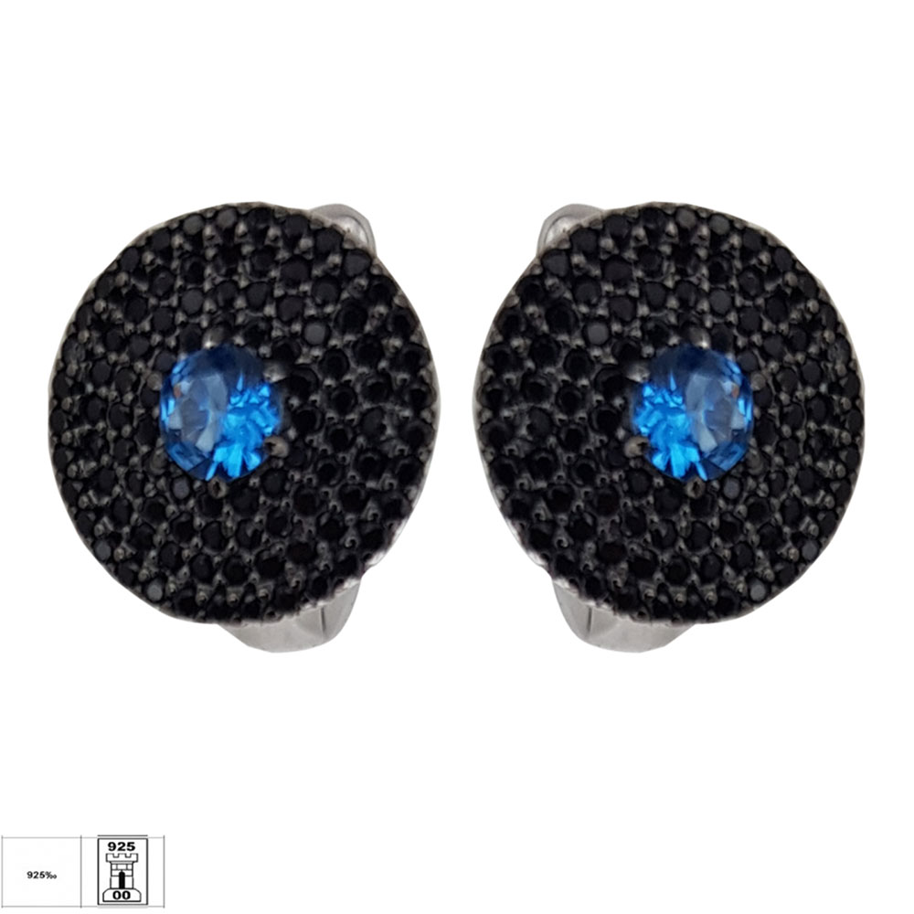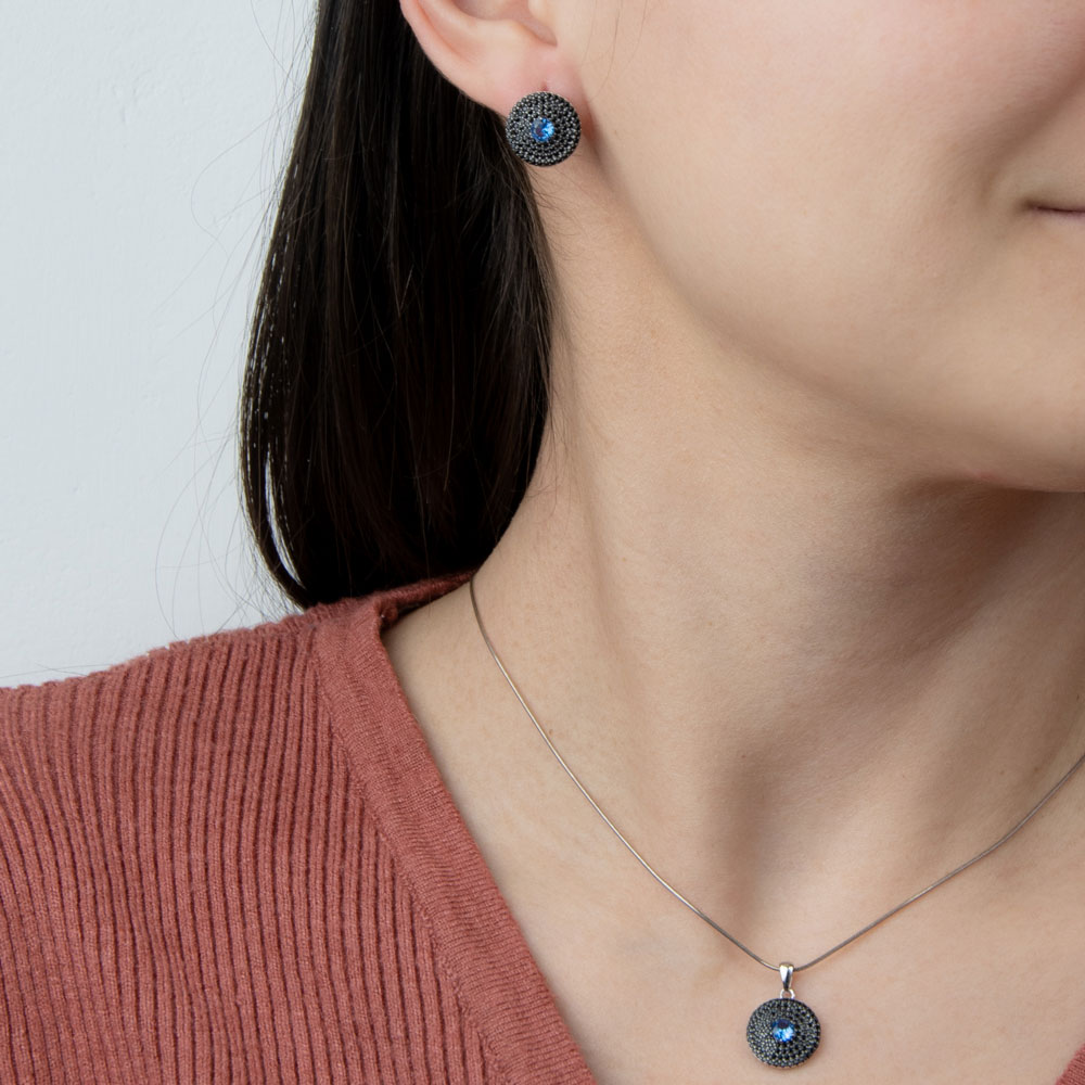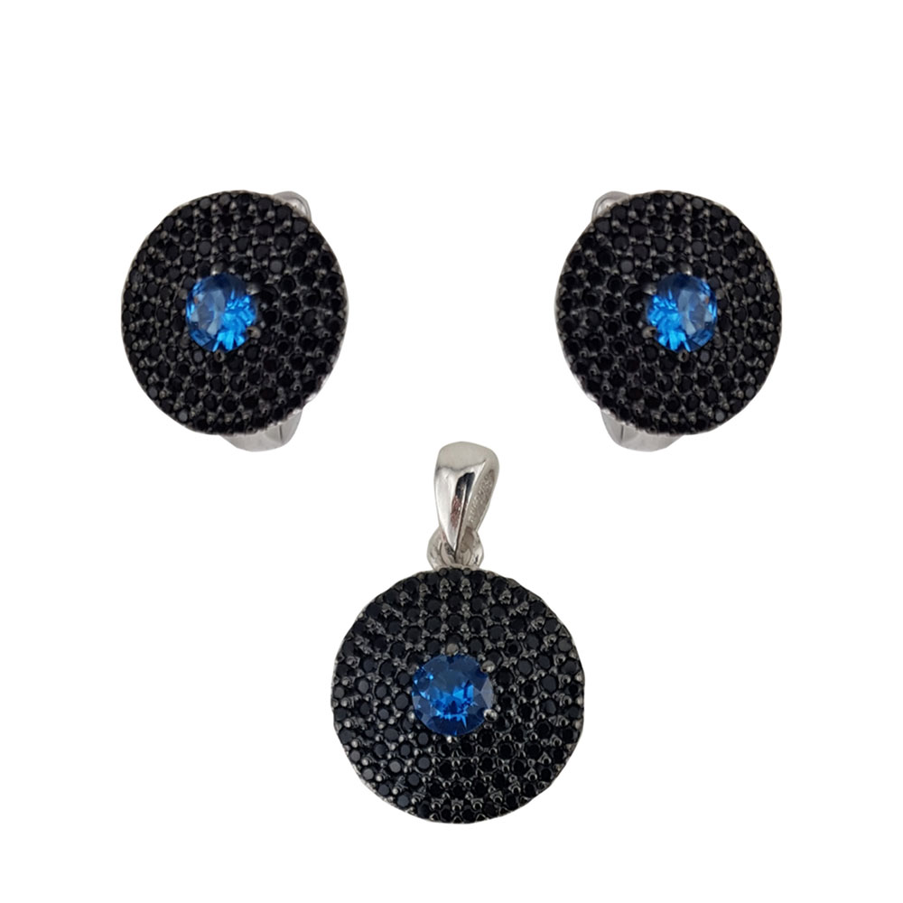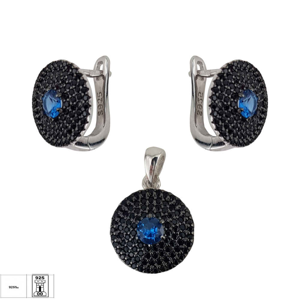 Explorati frumusetea si rafinamentul cu Setul de bijuterii Rankine, creat din argint 925. Acest set unic include cercei si pandantiv decorati cu zirconii negre care adauga o stralucire discreta si zirconii albastre centrale ce ofera un contrast vibrant.
