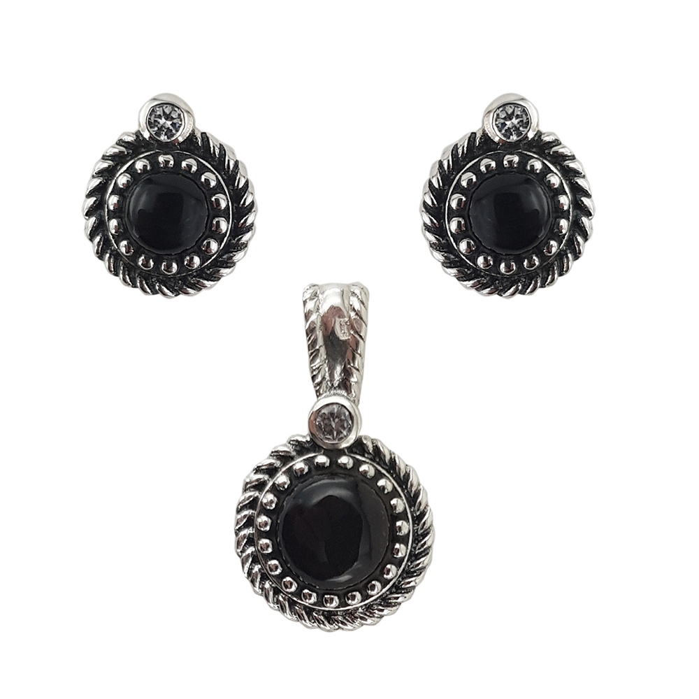 Set din argint 925, cercei si pandantiv, decorat cu onix negru si zirconii albe. Cerceii se inchid cu surub.
