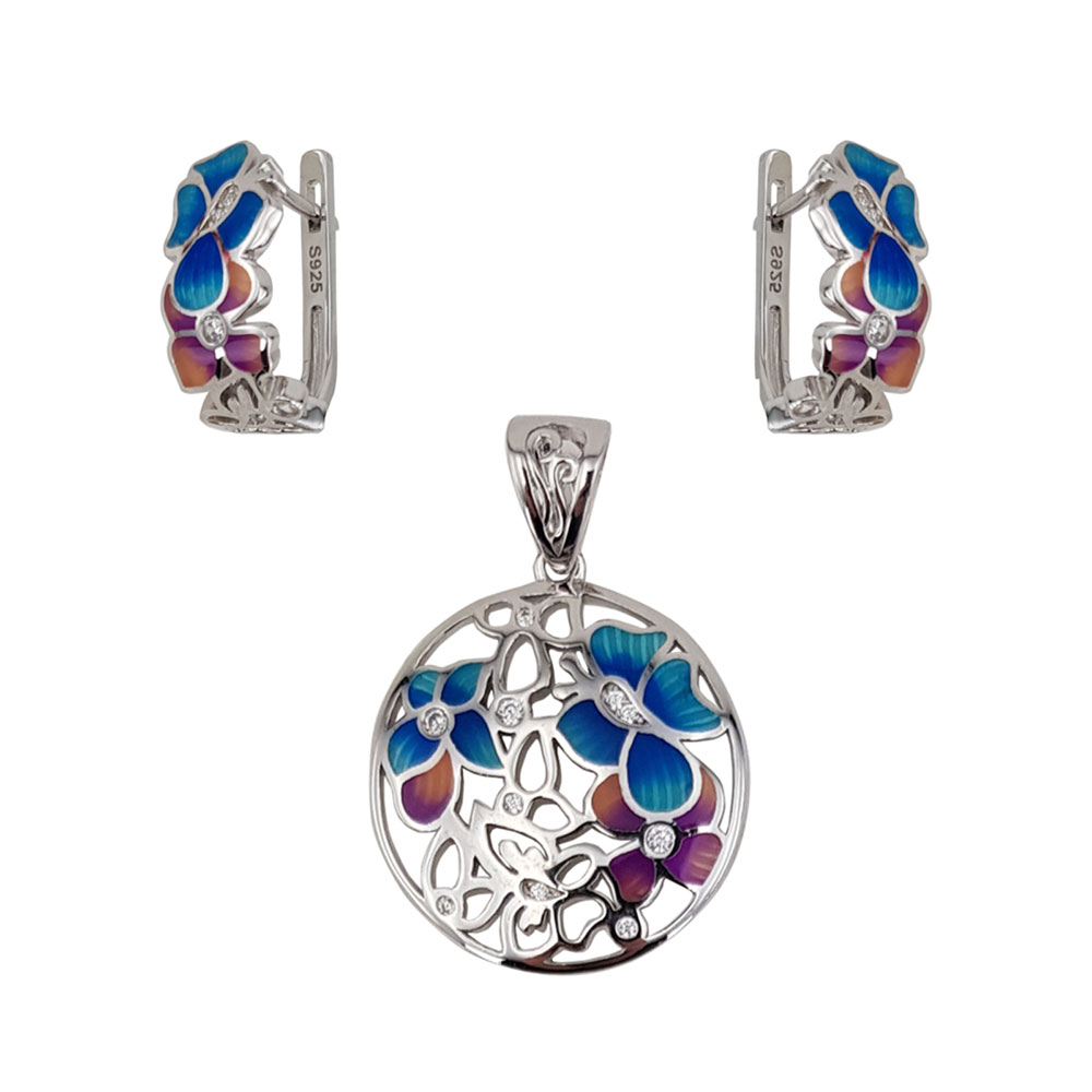 Detaliile florale si fluturii in nuante de albastru, mov si roz, accentuate de emailul viu colorat, transforma fiecare piesa intr-o declaratie de feminitate si eleganta. Cerceii cu inchidere de tip tortita asigura confort si siguranta la purtare, iar pandantivul generos completeaza armonios tinutele de zi sau de seara.
