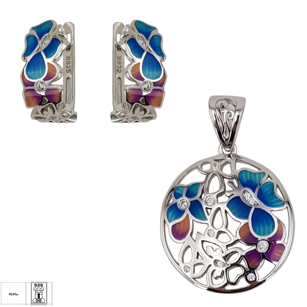 Exprima-ti stilul cu setul de bijuterii din argint 925 Frey, compus din cercei si pandantiv cu un design floral rafinat si accente de fluturi, decorat cu email multicolor si zirconii stralucitoare. Acest set este realizat cu maiestrie, din argint 925 autentic, conform normelor in vigoare privind metalele pretioase, garantand calitate si durabilitate.
